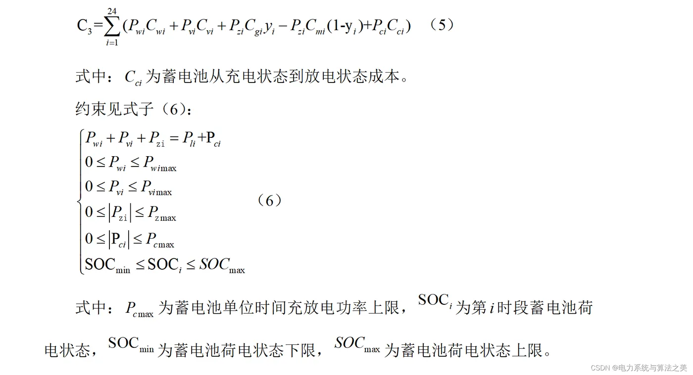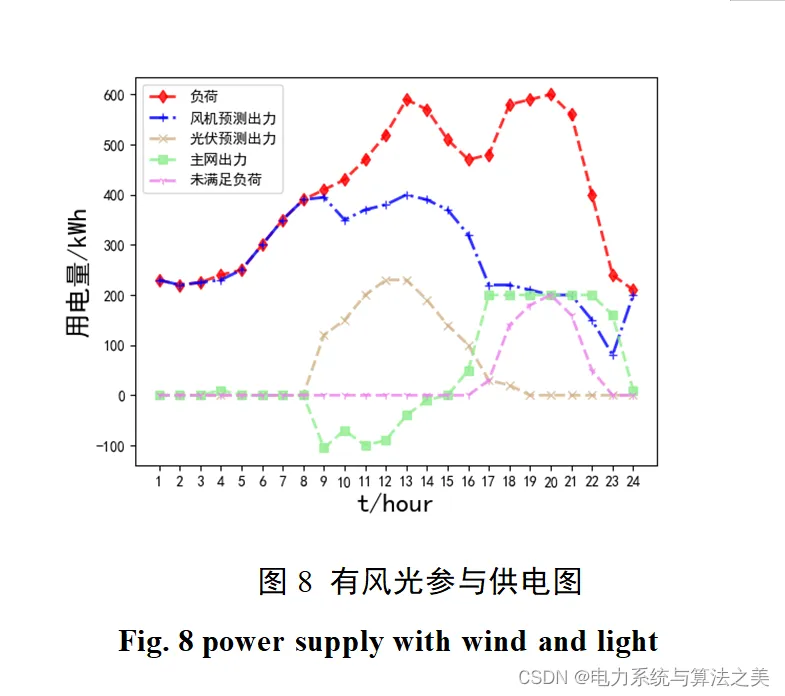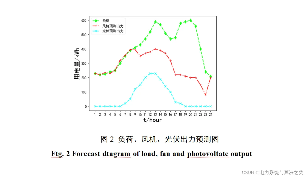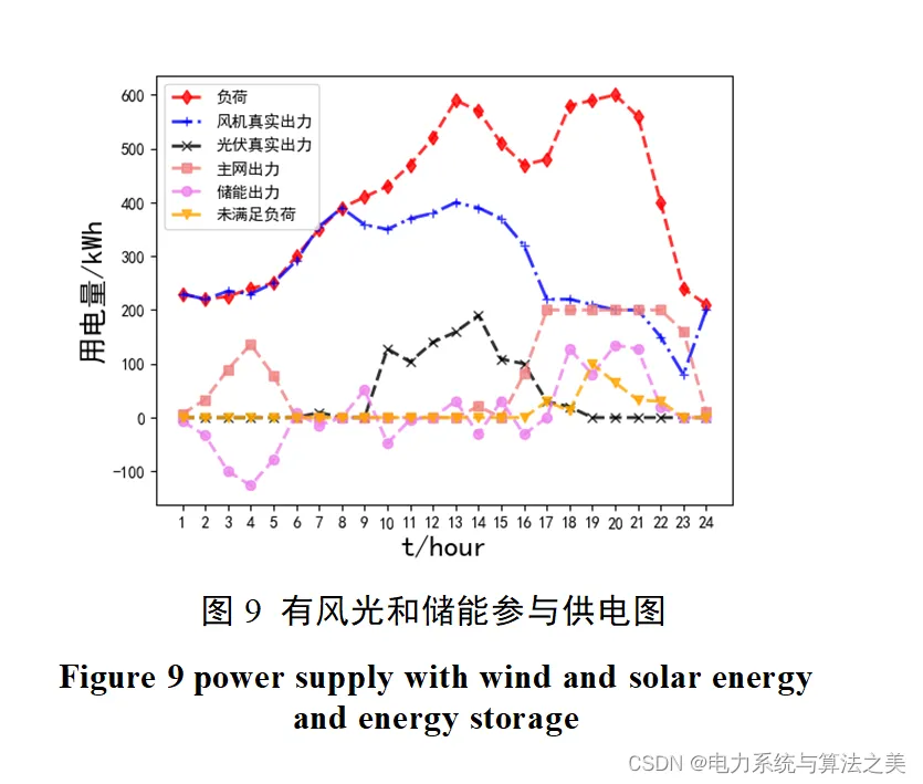 通过制定策略:风力发电成本最低,所以对于可再生能源发电,优先发风机。然后我们采用允许弃风、弃光的方法,得到可再生能源的最优出力后,若较负荷所需功率不足,则由主网供电。还对风、光、储能和主网出力越限做了惩罚项处理。
