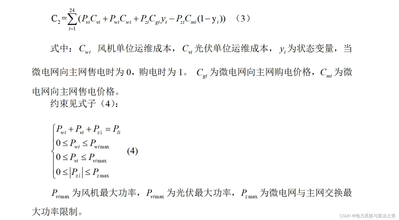 若较负荷所需功率不足,不足部分向主网购买;若剩余,则剩余部分售卖给主网。光伏和风机可以舍弃部分。同时微电网与主网交换功率有约束。则目标函数见式子(3):