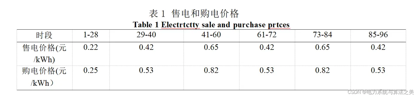 风机的装机容量360kW,单位运维成本0.52元/kWh。光伏的装机容量 260kW,单位运维成本0.75元/kWh。蓄电池额定容量为700kWh,电池 SOC 运行范围 为[0.4,0.9],初始 SOC 值为 0.4,由充电至放电成本为 0.1 元/kWh,1个小时充放电功率最大为储能的20%。微网与主网允许交换功率不超过 200kW。一天的售电和购电价格见表1。