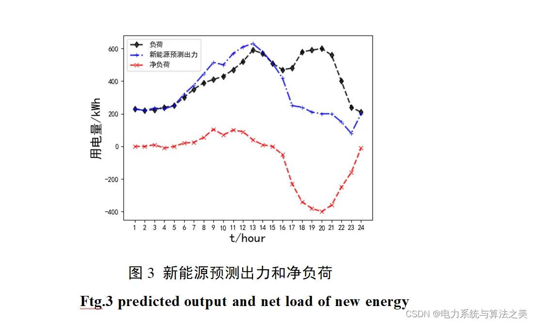风机出力、光伏出力、常规负荷日前(未来 24 小时)预测见图2,新能源预测出力和净负荷,净负荷表示的是风机、光伏满足负荷后的剩余功率,如图3所示。