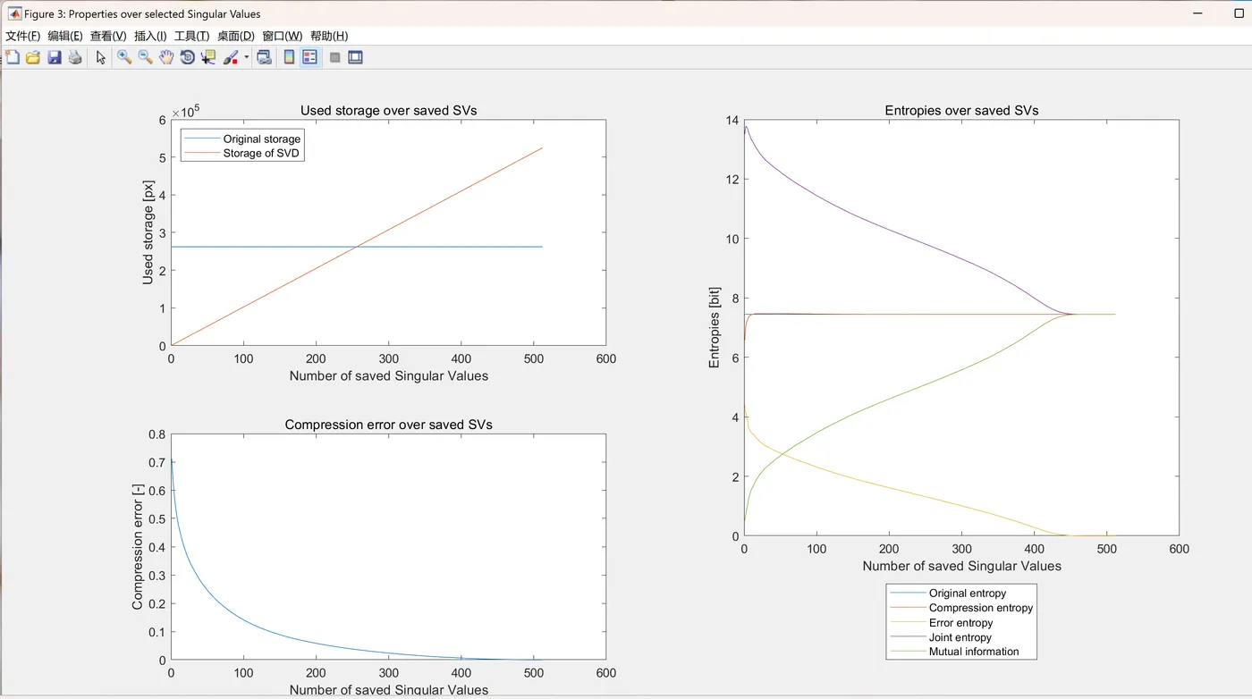 % return error error(... 'Incorrect input arg: compr must satisfy 0 <= compr <= number of Singular Values'); % Size of the image m = size(Lena,1); n = size(Lena,2); storage = m*n; fprintf('Size of image: %d px by %d px, i.e. uses %d px of storage.\n',m,n,storage); % SVs and reduced storage r = min([m,n]); % original number of SVs r_red = length(indices); % to be saved number of SVs r_max = floor(m*n/(m+n+1)); % maximum to be saved number of SVs for compression storage_red = m*r_red + n*r_red + r_red; if compr >= 0 && compr < 1 % only SVs bigger than compr times biggest SV fprintf('The smallest SV chosen to be smaller than %d of the biggest SV.\n',compr); elseif compr >= 1 && compr <= length(singvals) % only the biggest compr SVs else % return error fprintf('There was some error before. Analysis cannot continue.\n') end fprintf('Out of %d SVs, only %d SVs saved ',r,r_red); fprintf('(Maximum number of SVs for compression: %d SVs).\n',r_max); fprintf('Reduced storage: %d px.\n',storage_red); % Determine made error error = 1 - sum(singvals(indices))/sum(singvals); fprintf('Made error: %d.\n',error); errorImage = Lena_org - Lena_red; % Entropy