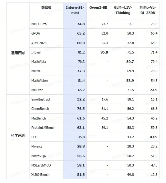 凭借领先的通用与专业科学能力,Intern-S1 上线后连续多日霸榜 HuggingFace 多模态 Trending 全球第一,并在开源社区引发了广泛关注。作为 8B 参数的“迷你模型”,Intern-S1-mini 同样兼具通用能力与专业科学能力,且更加适合快速部署和二次开发。Intern-S1-mini 性能速览: