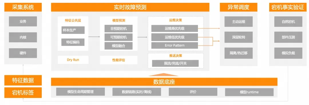 治病的最高境界是治病于未病,将问题消弭于萌芽之前。为此,ECS 依托数据和算法中台系统性构建了智能故障预测体系,核心是异常预测数据闭环、预测工程化闭环以及强大的异常预测业务模型。异常预测数据闭环,建立了可应用于云服务器预测的数据清洗标准和完整的异常数据标注体系,包括:异常数据采集汇聚、异常数据清洗、弹性计算特征工程和告警中心、异常根因分析和数据标注;预测工程闭环,核心是建立了异常预测模型循环迭代优化的完整机制,包括:数据清晰与 ECS 特征工程、ECS 异常预测模型、预测结果流入 ECS 异常调度中心、异常服务器压测闭环、压测结果标注、bad case 分析和评价机制;针对异常预测业务模型,构建业务模型管理系统,将所有算法模型进行全生命周期管理,实现模型良性循环迭代。当前,智能故障预测已在 ECS 多个场景大规模应用,准确率和召回率达 90% 以上,提前发现了 70% 以上的故障隐患。