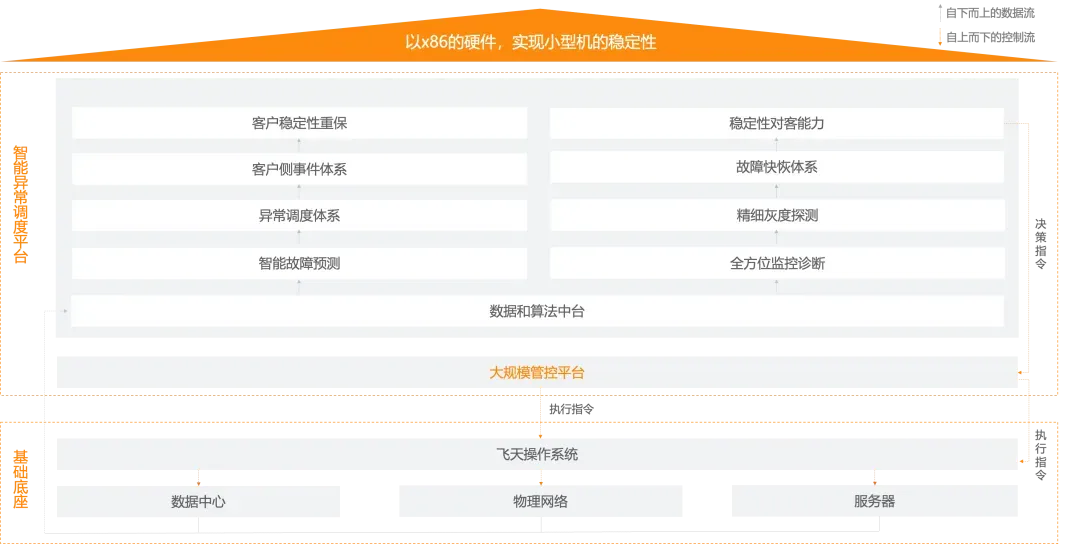 为了实现“以 x86 的硬件,实现小型机的稳定性”这一极具挑战的目标,ECS 对稳定性架构和体系提出了极高要求,ECS 每个组件从设计的第一天,稳定性(异常率,可观测,可规避)就是系统设计的核心指标。标准的数据和控制规范连通了所有组件,他们之间相互分工协作,使得整个 ECS 的稳定性螺旋上升,持续提高。ECS 稳定性保障体系整体架构如下图所示: