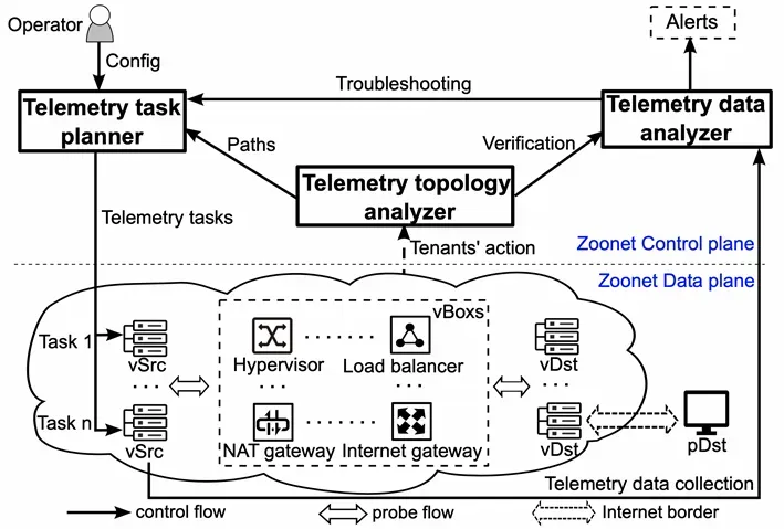 7*24 主动式遥测 ZooNet。传统的物理网络用于诊断网络问题的方法,如 ping、traceroute 用于解决客户网络的问题效率比较低,这来源于这些方法无法完全覆盖虚拟网络协议栈、缺乏虚拟网络和物理网络的精确映射、旁路中间件、无法覆盖用户粒度的跨 VPC 或者 internet 边界。为此,洛神推出主动式遥测 ZooNet,实现在所有租户 7*24 的主动式覆盖,实现主动发现问题,发生问题后的快速排查。