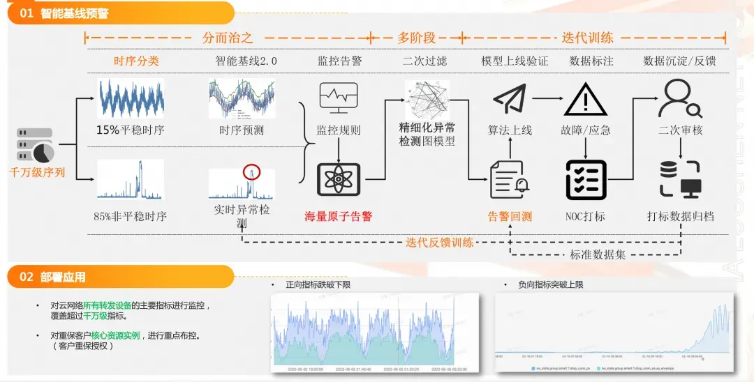 智能监控是无人值守发布的关键。智能监控对集群粒度和产品实例粒度的测量数据预测。针对 15% 平稳时序的数据,如大集群的整体流量,采用智能基线的方式,预测未来流量的上下限,当流量超出上下限时系统给出原子的告警。对于 85% 非平稳时序,如大部分中长尾产品实例的突发流量,监控其陡升陡跌、流量非超规格丢包等异常点。监控产生海量原子告警,通过多维度的聚合关联告警,通过AI训练的指标关联度进行更精细化异常检测计算,最终产生告警,进行异常自动刹车。