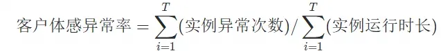 定义合适的 ECS 稳定性后端技术指标,需要从客户的稳定性体验出发,凡是影响客户稳定性体验的因素,都需要纳入指标计算。影响客户 ECS 稳定性体验的因素众多,总体上可分为两个维度:一是异常类型,包括:实例宕机、夯机、GuestOS panic、性能抖动和主动运维等;二是异常影响程度,包括:异常发生的频率和持续时长。基于此, ECS 定义了度量稳定性的后端技术指标:客户体感异常率,该指标的含义为:ECS 实例单位运行时间内的异常次数,具体定义如下: