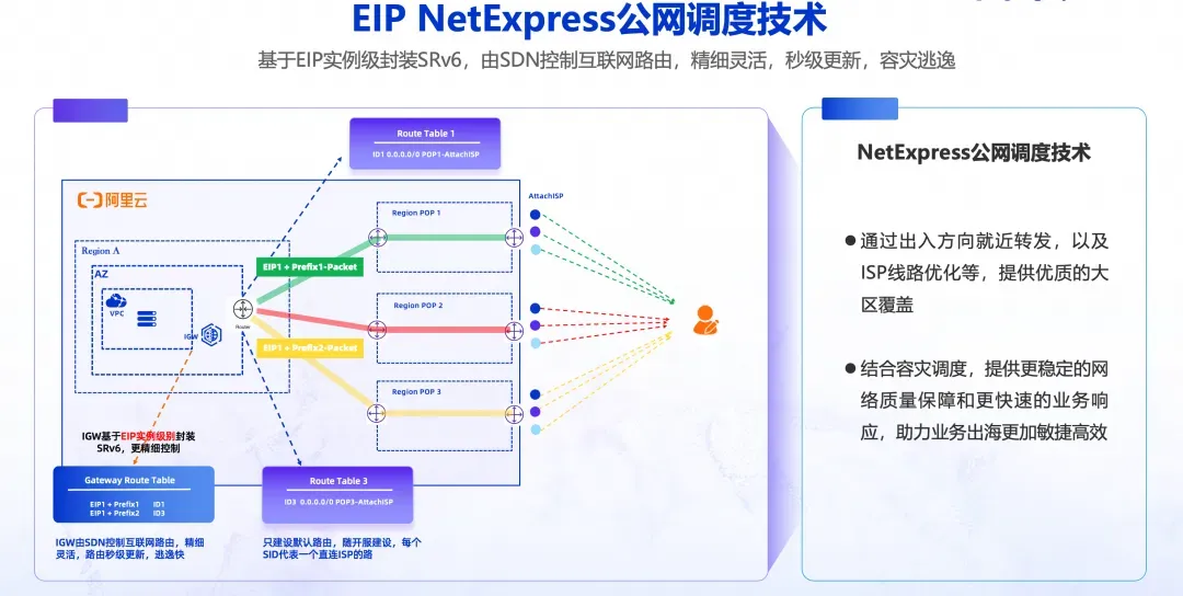 针对复杂以及不可控的 Internet 质量,除了加强公网互联资源建设,同时还需要进行技术创新,过去的公网质量调优更多是针对网段粒度的。但网段粒度很难满足不同客户千人千面的质量优化需求(除非这个网段的所有IP都是属于某个用户的), NetExpress 的目标是支持单EIP粒度的流量调度。