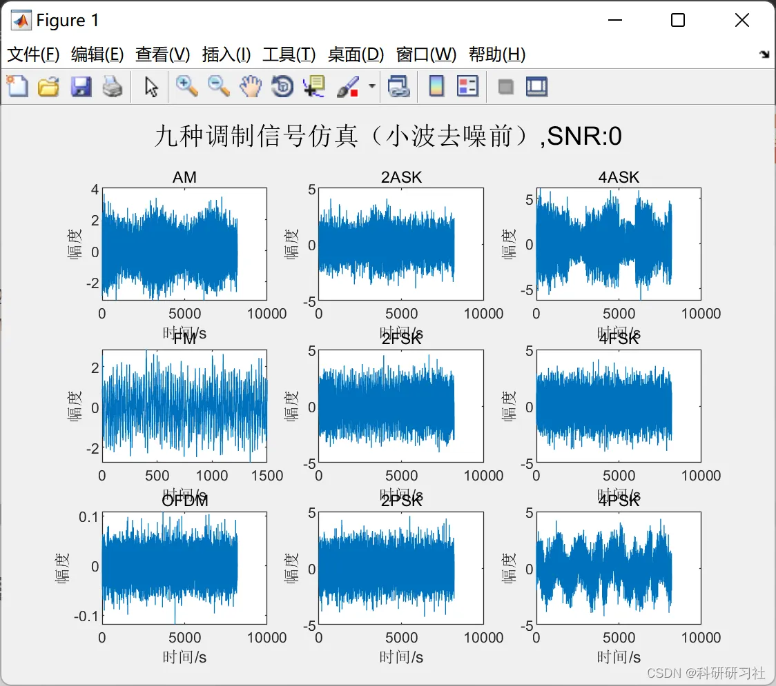 subplot(3,3,6),plot(yfsk_4_W),title("4FSK"),xlabel("时间/s"),ylabel("幅度");