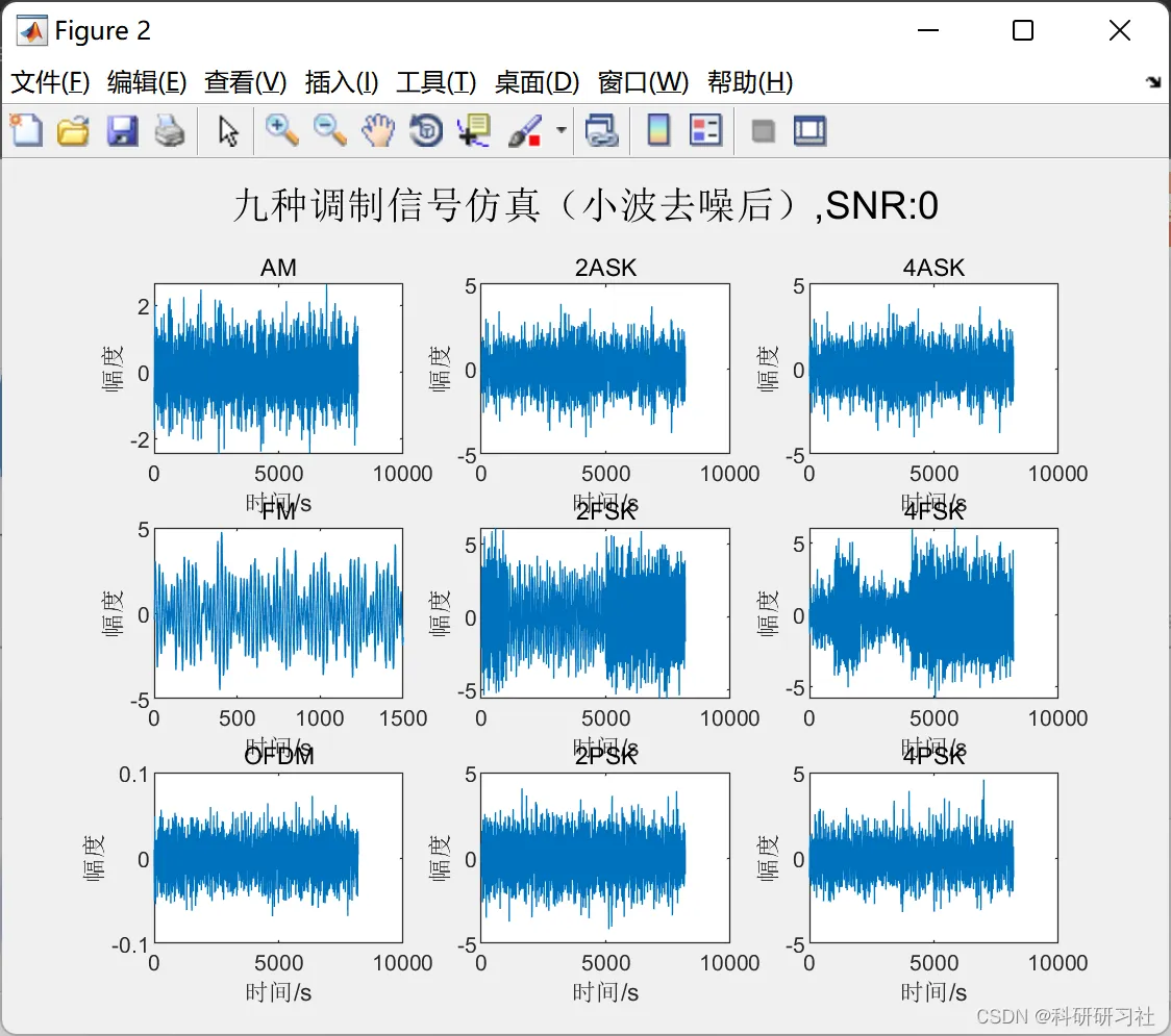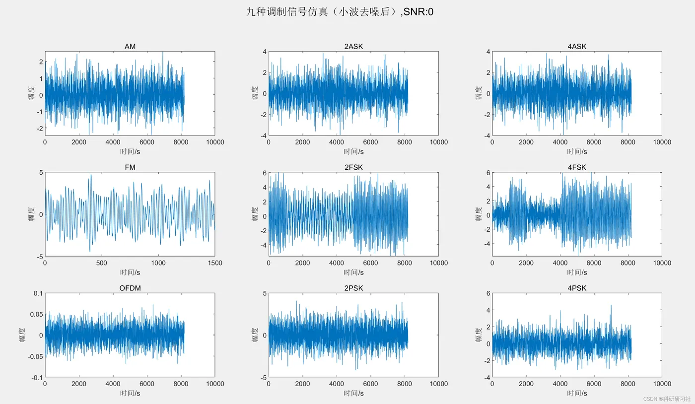 suptitle('九种调制信号仿真(小波去噪后),SNR:0')