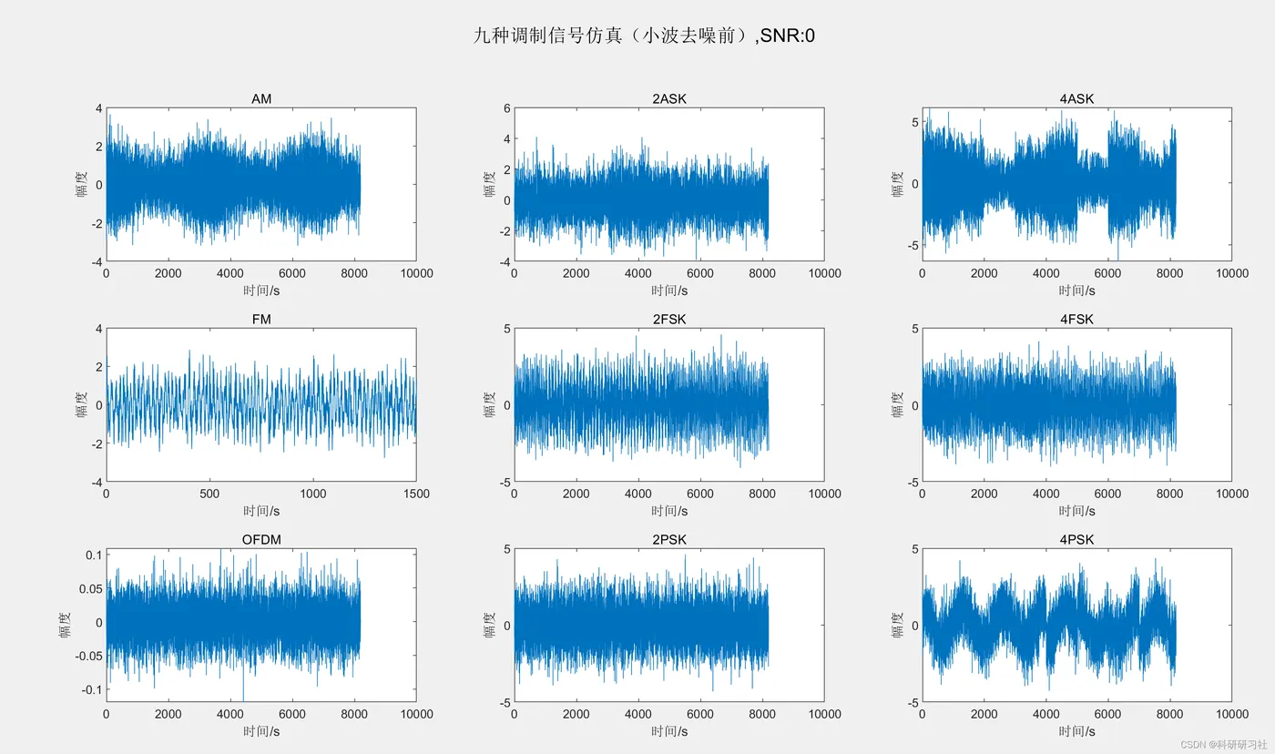 suptitle('九种调制信号仿真(小波去噪前),SNR:0')
