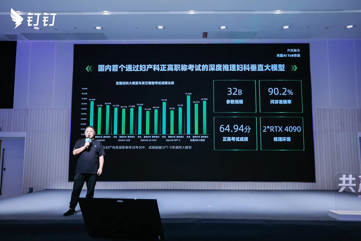 在钉钉10周年发布会上,壹生检康CEO王强宇宣布,其自主研发的豆蔻妇科大模型(doukou.ai),在国家妇产科卫生高级职称(正高)笔试考试中成绩以64.94分的成绩超过GPT-5的52.59分,同时正式开放网页版试用。这一结果不仅彰显了国产医疗人工智能在专业化赛道上的快速进步,也展示了垂直行业大模型更高的实际应用价值,为人工智能赋能医疗临床实践提供了新的样本。