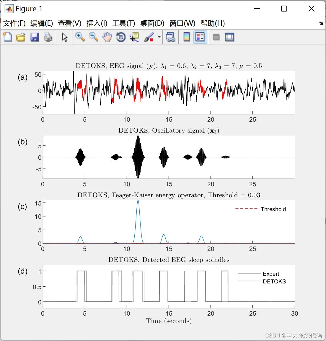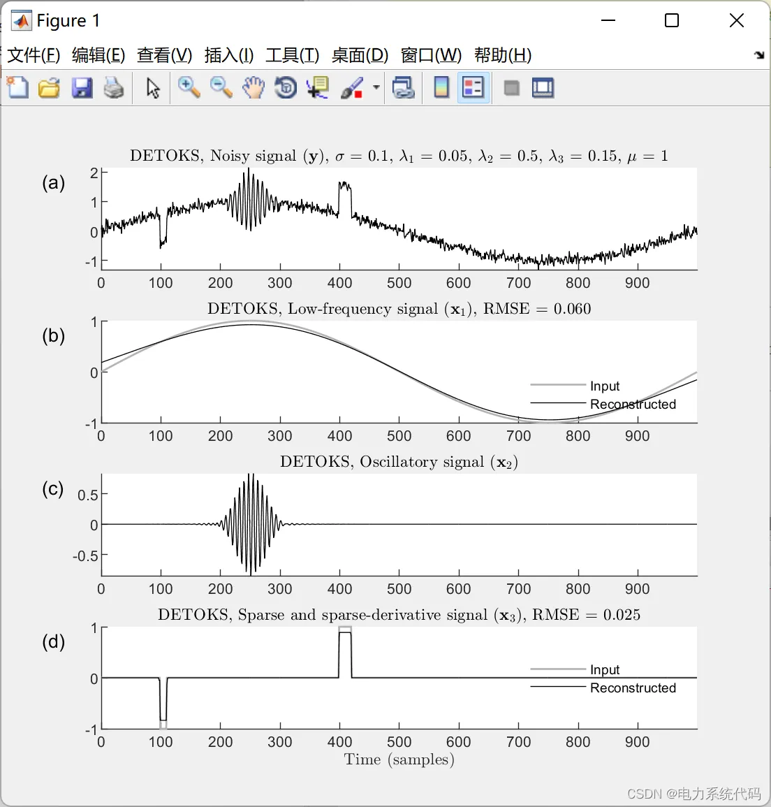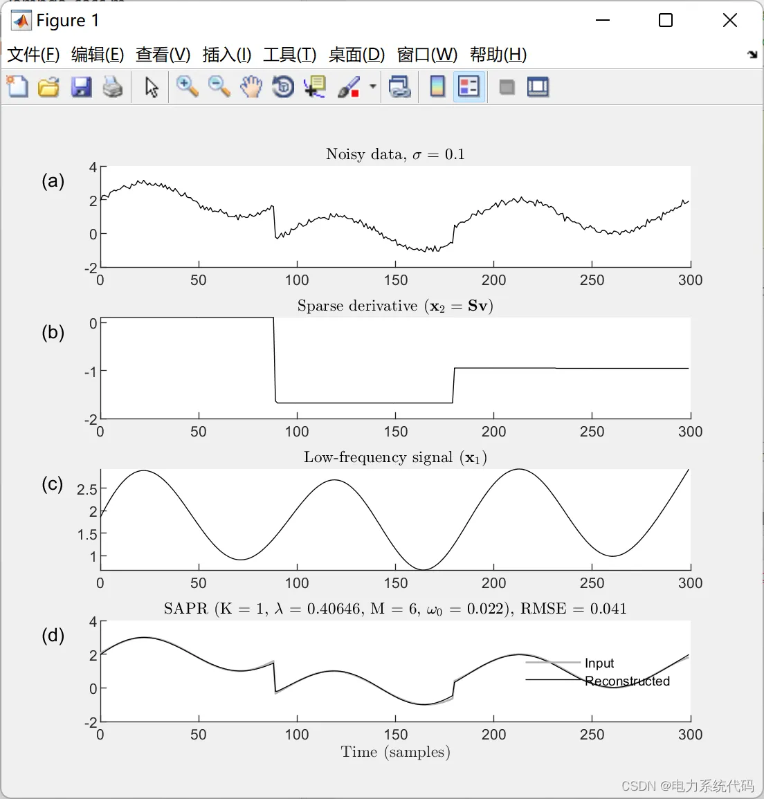 稀疏辅助信号去噪( SASD )算法同时结合全变差去噪和低通滤波对含噪信号进行滤波,从而保持了信号的不连续性。在这个例子中,我们使用LPF、TVD、SASS和SASD对心电信号进行去噪: