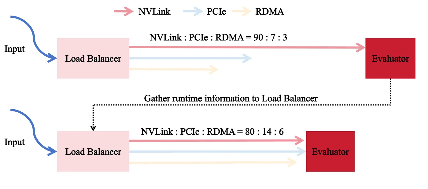 - 初始化阶段: 基于硬件信息建模,设定初始负载比例。随后在短时间内进行微调(按步长转移负载),监测链路性能偏序关系变化。若关系反转(如慢链路变快),则减半步长并迭代优化,数秒内收敛到较优状态。
