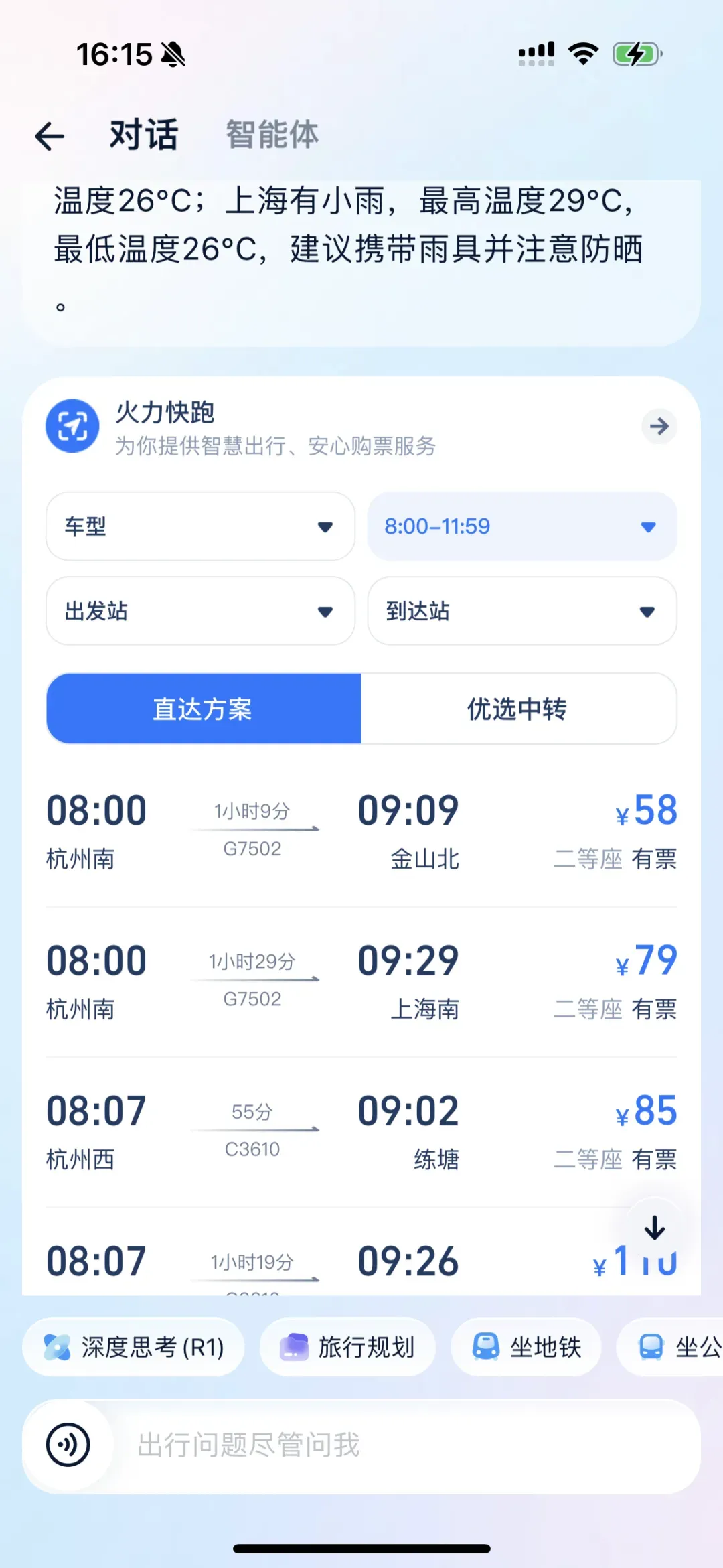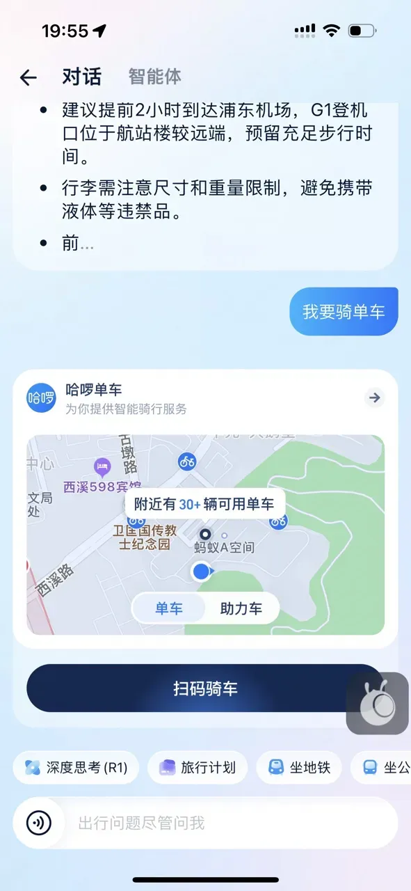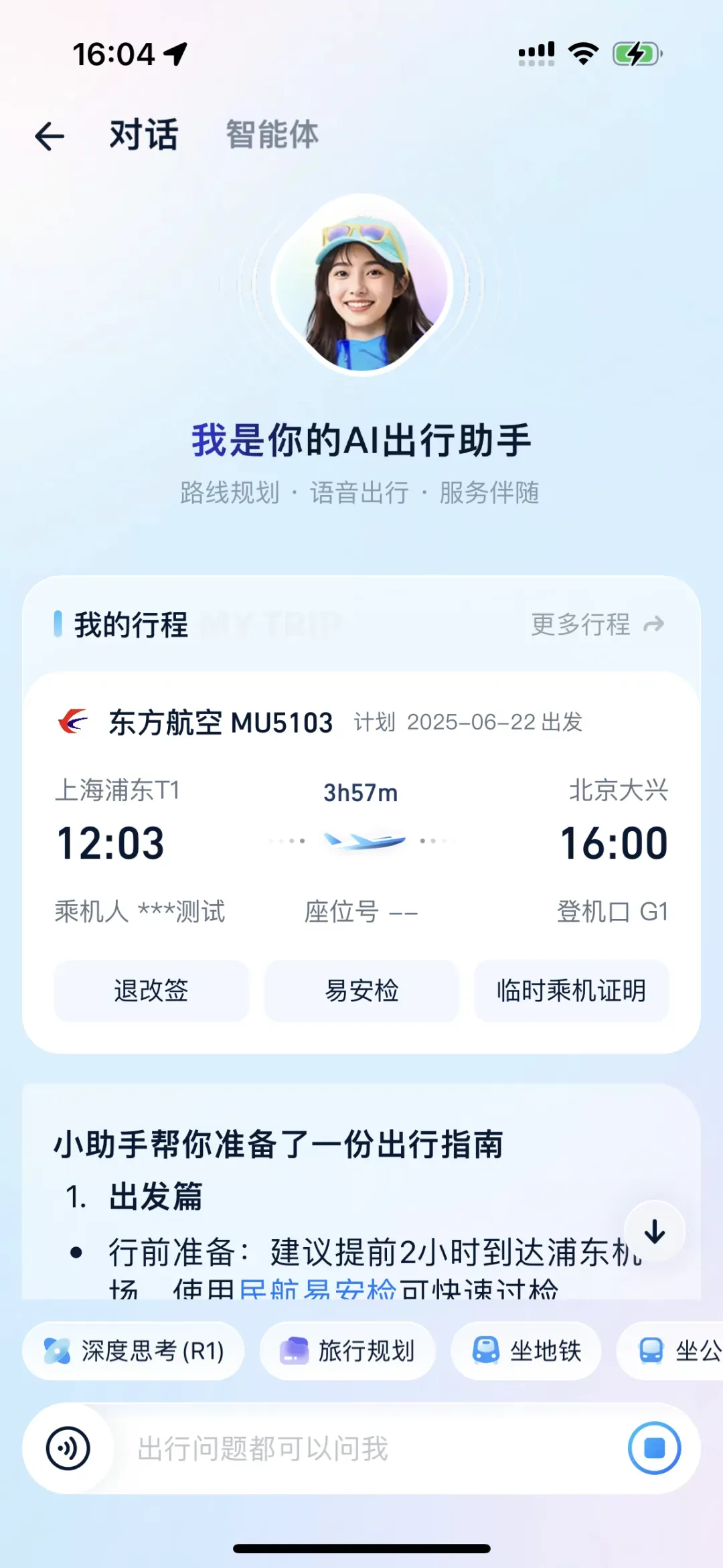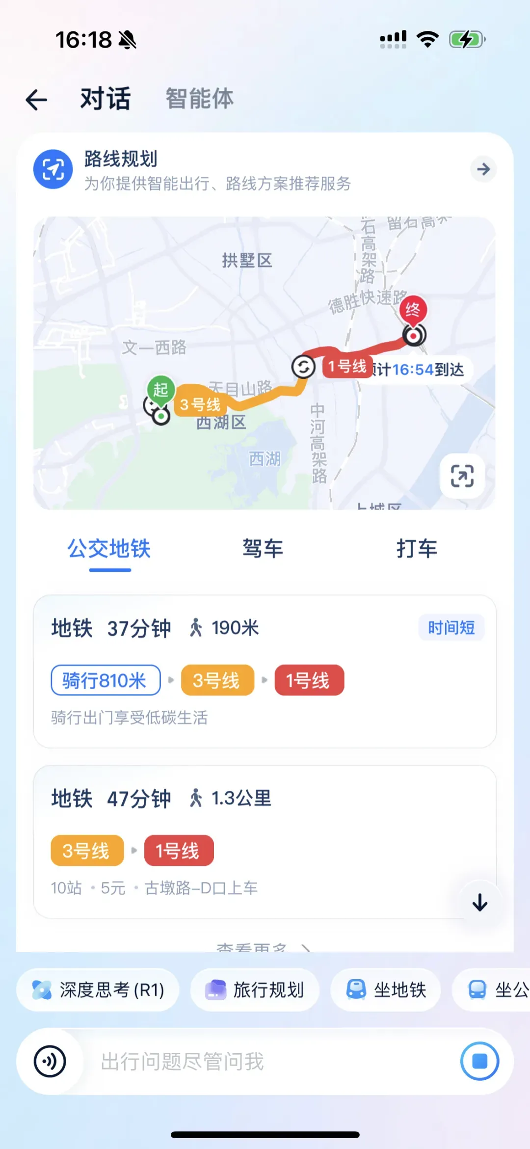 AI 出行助手是一款基于对话交互的智能出行服务产品,集成公交/地铁刷码、火车票/机票预订、单车/打车、路线规划/旅行方案生成等核心功能,为用户提供全链路的出行服务。