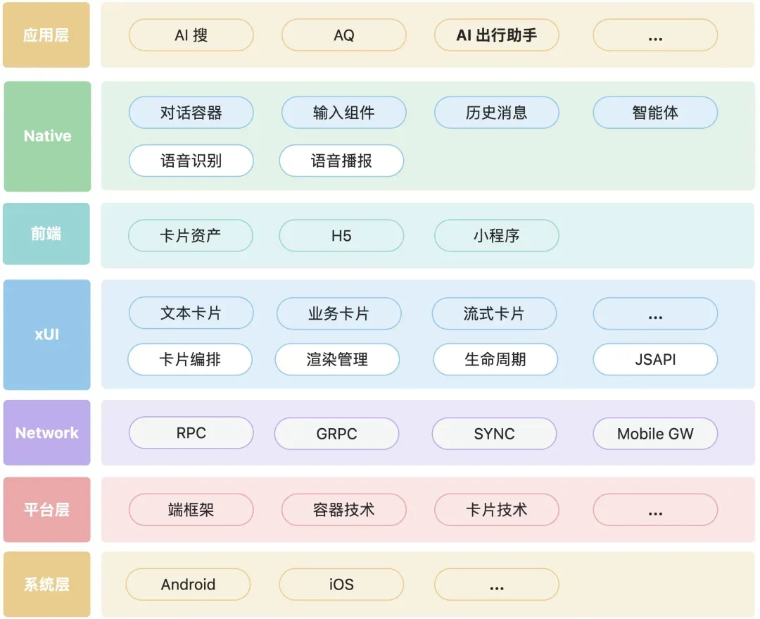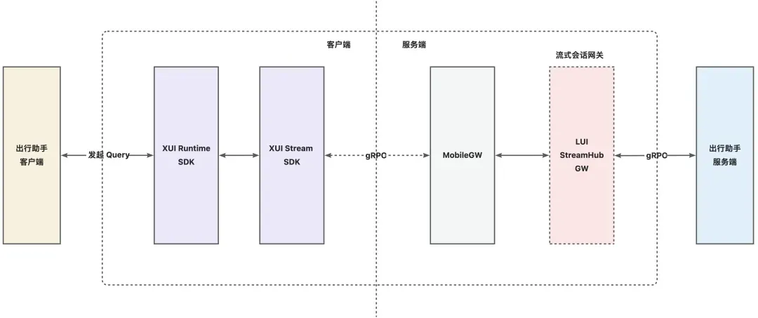 AI 对话作为一种新的交互范式,在技术和架构选型上缺乏成熟的最佳实践。幸运的是,在 AI 出行助手项目启动前,支付宝内已有多款 AI 助手类产品上线或在研,如 AI 搜、AQ 等,它们作为先行者,率先探索了 xUI 生成式卡片和 gRPC 流式通信,为我们验证了现代 AI 交互方案的可行性。