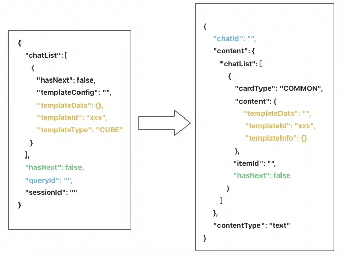 templateData复用外,templateId、templateInfo等涉及卡片的部分也保持不变,然后依次将chatId、itemId、hasNext等关键字段装载到新协议的结构体中。