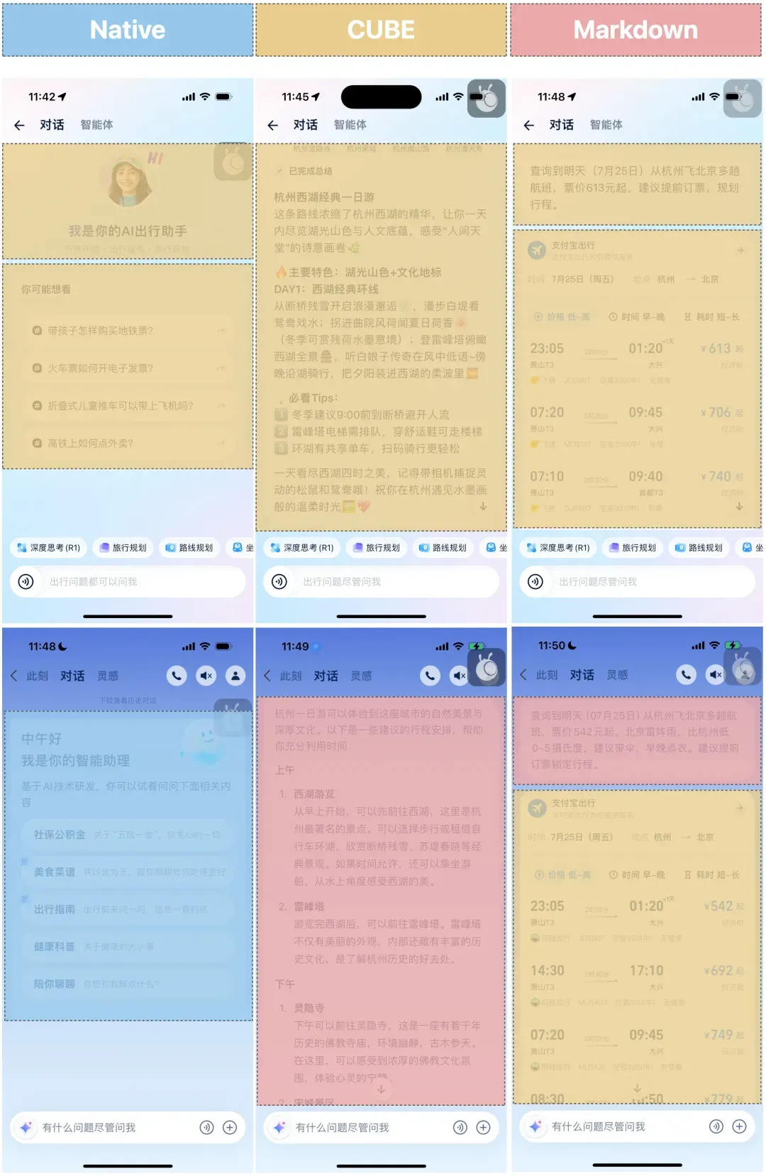 在 AI 出行助手中,我们面临着一个历史遗留问题:从支小宝继承而来的渲染体系,是由 Native、卡片和Native Markdown 组件组成的碎片化架构,维护成本较高: