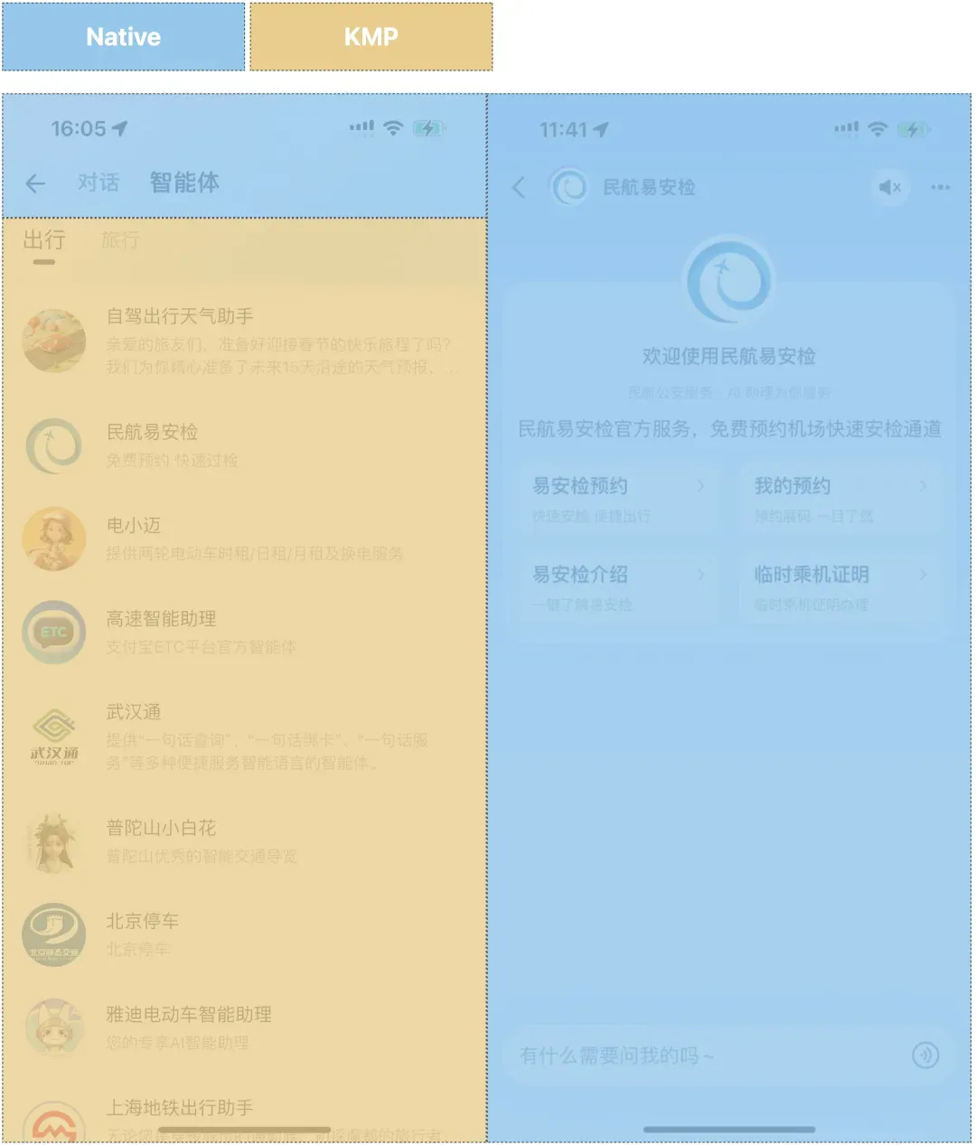 - 智能体列表在结构上并非一个独立的页面,而是与主会话页面同级。因此,我们采用了 MicroPage 的方案,将 KMP 视图作为一个独立的 UI 模块,嵌入到原生的容器中;