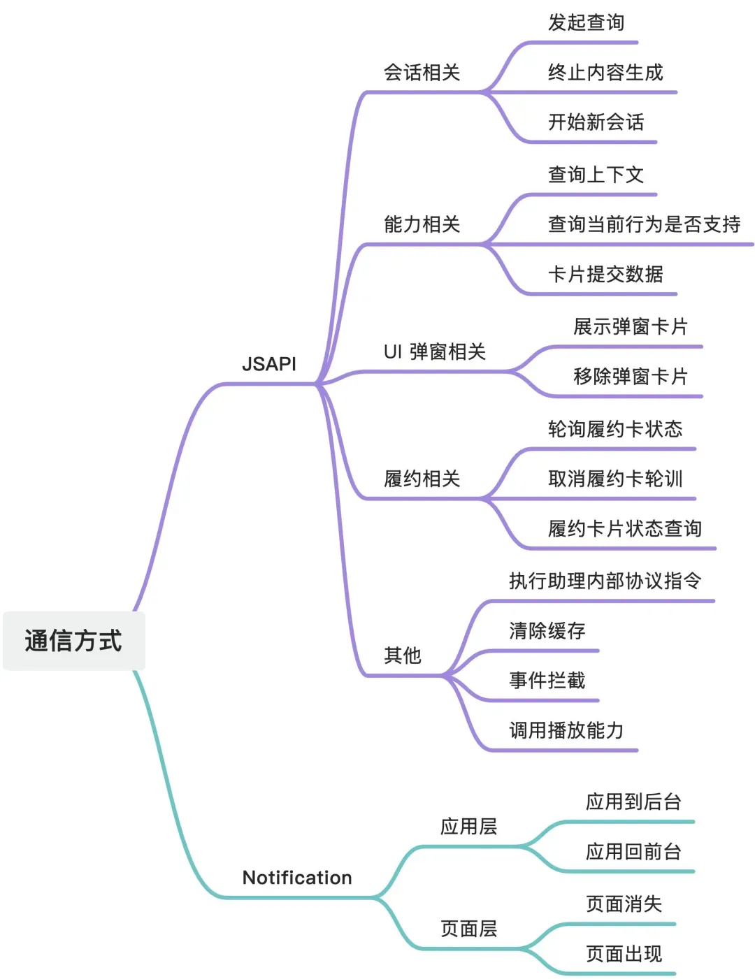 - JSAPI :卡片主动调用 Native 的接口,如发起查询、停止生成等;
