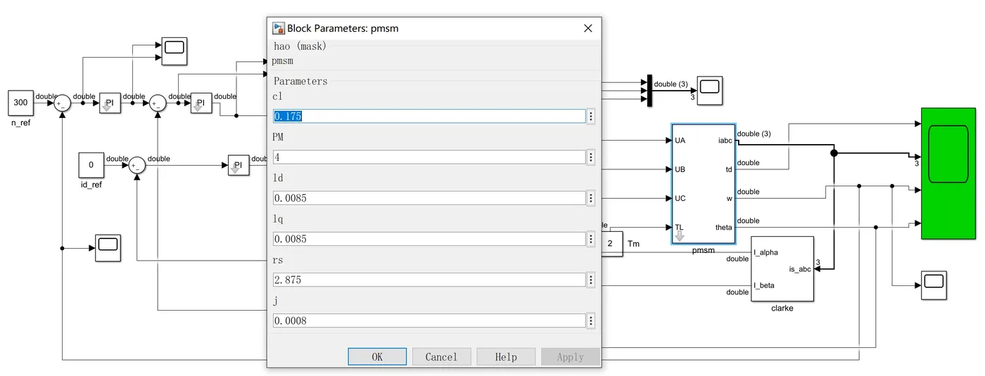 - PMSM本体模块:采用Simscape Electrical库中的永磁同步电机模型,参数设置为:额定功率2.2kW,极对数4,定子电阻0.5Ω,直轴电感8.5mH,交轴电感8.5mH,永磁磁链0.175Wb。