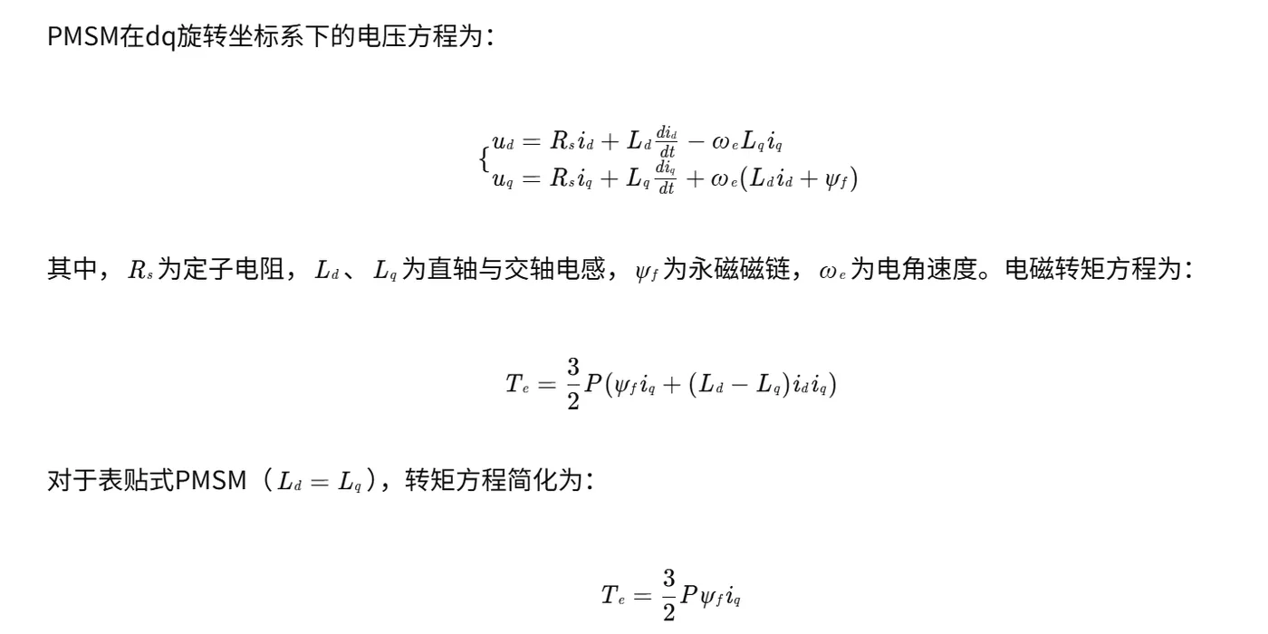 矢量控制通过解耦定子电流的励磁分量(id)与转矩分量(iq),实现类似直流电机的转矩控制。本文采用id=0控制策略,此时电磁转矩仅由iq决定,控制器设计简化为单变量调节问题。