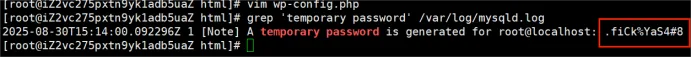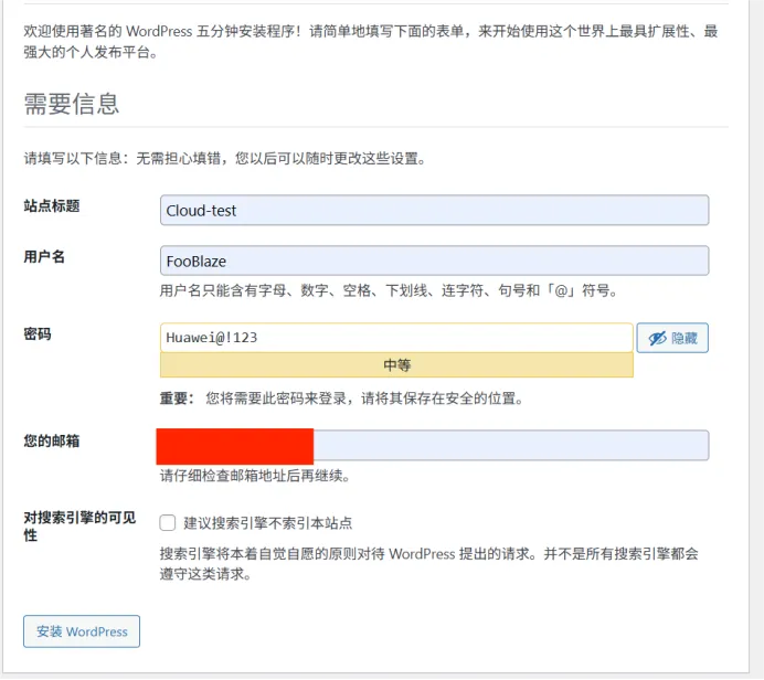 >>> 配置 Nginx nginx: [warn] conflicting server name "_" on 0.0.0.0:80, ignored nginx: the configuration file /etc/nginx/nginx.conf syntax is ok nginx: configuration file /etc/nginx/nginx.conf test is successful >>> 配置防火墙 FirewallD is not running FirewallD is not running ============================================ WordPress 已安装完成! 浏览器访问: http://<你的ECS公网IP> 数据库名: wordpress 数据库用户: wpuser 数据库密码: aliyun@!123 MySQL root 密码: aliyun@!123 ============================================