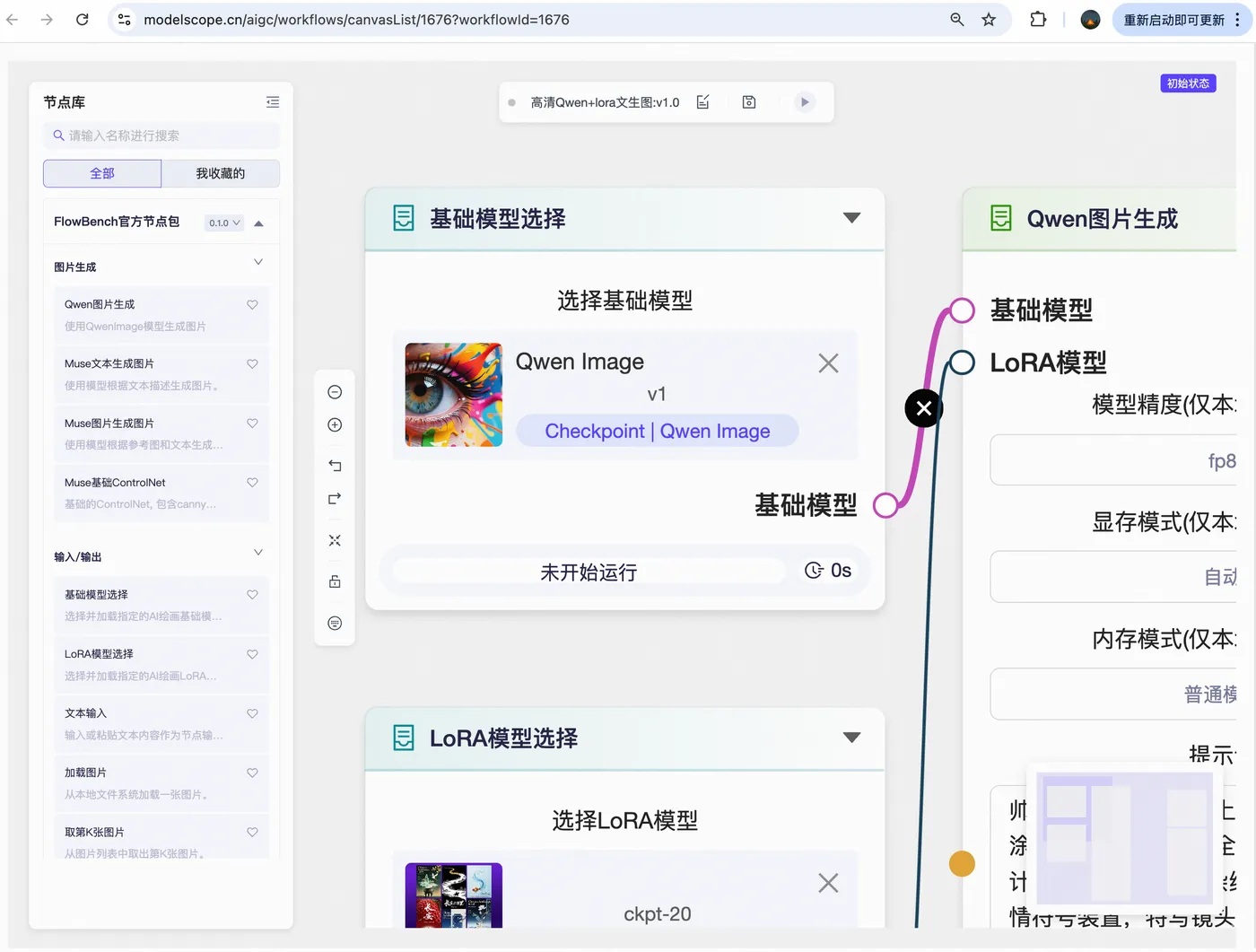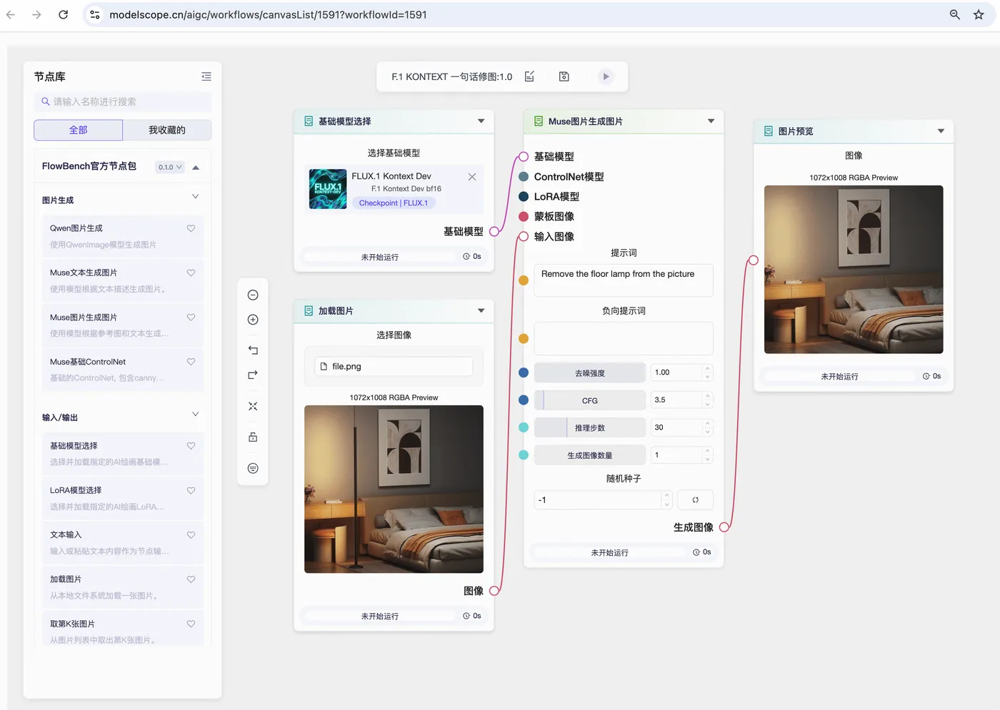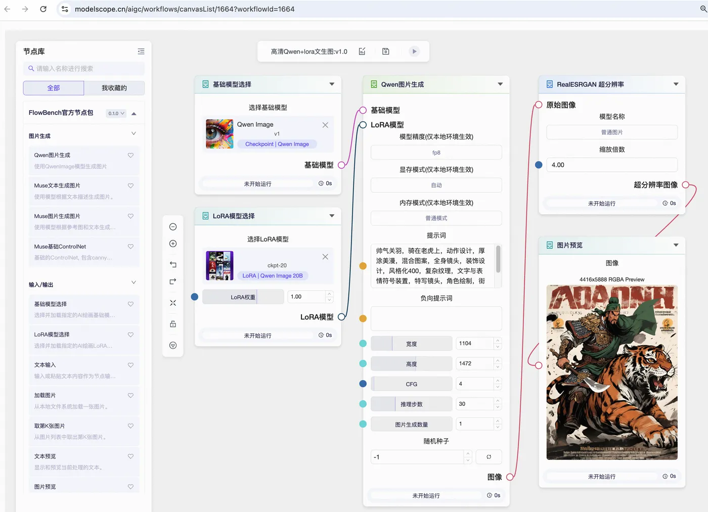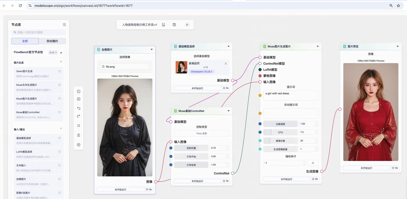 这一功能由 ModelScope x Muse 团队共同打造,旨在为 AIGC 创作者、设计师和开发者提供一个云端工作流创作平台。通过这一平台,用户可以在工作台自由搭建自己的工作流,并在魔搭社区发布和分享,同时还可以使用云端免费资源运行自己或他人的工作流,从而获得更灵活、更自由的生成创作体验。