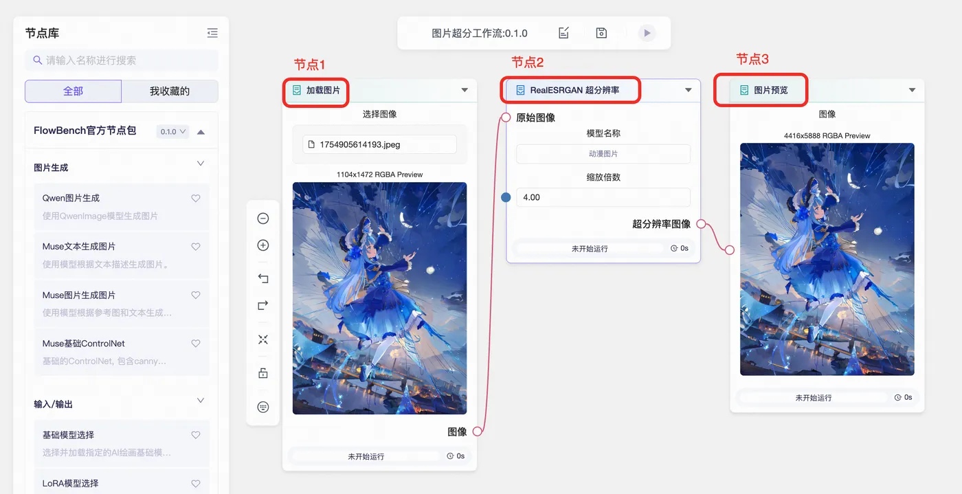 其中,加载图片和图片预览属于输入输出节点,而超分辨率属于功能节点。官方提供的节点库中包含了各种功能节点,您可以根据需求自由选择。