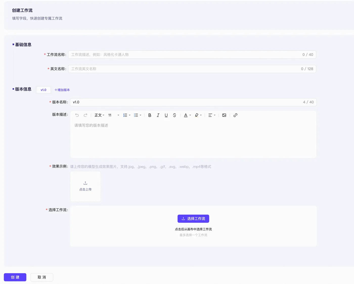 - 填写页面信息(如工作流名称、描述等),点击“创建”,即可完成分享。
