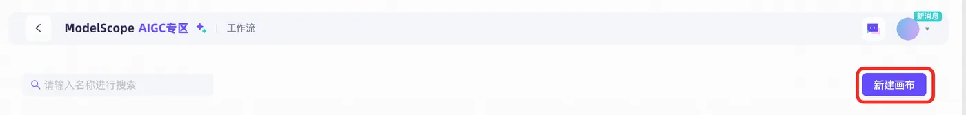 - 在工作流主页,点击“打开工作台”,然后点击“新建画布”。
