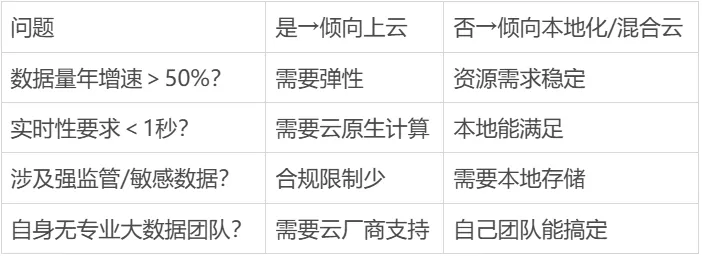 为了方便大家快速做决定,我总结了一个“数据上云决策矩阵”,有4个关键问题,每个问题对应不同的选择倾向:
