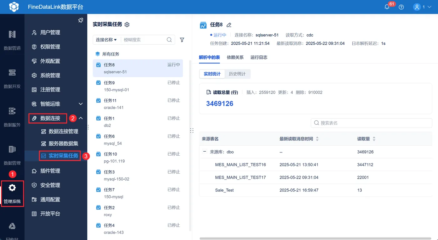 比如FineDataLink中创建管道或者实时任务后,在「管理系统>数据连接>实时采集任务」中自动新增实时采集任务,不需要手动新增,让一切都基于实时、管道任务的功能逻辑自动化处理。
