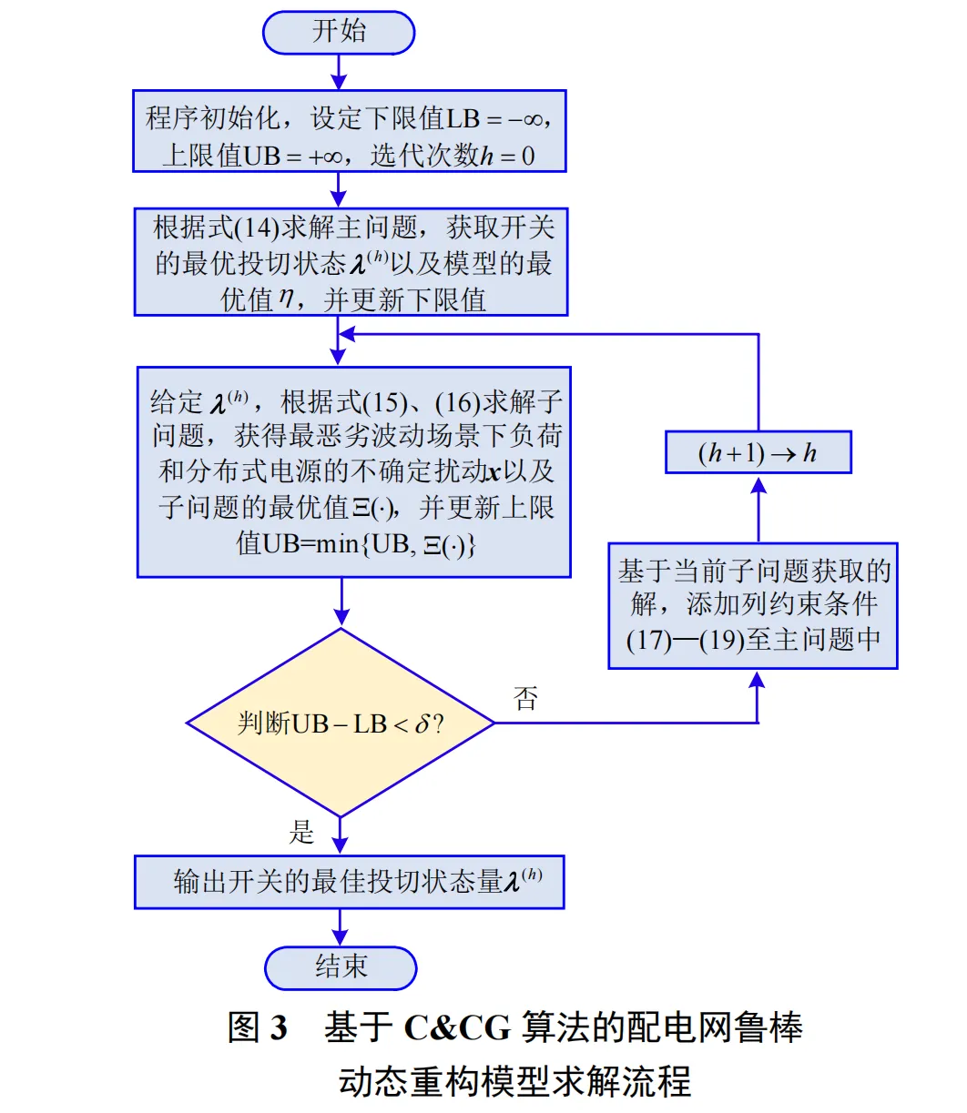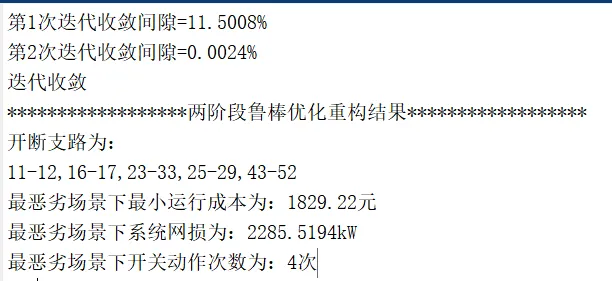 - 两阶段鲁棒优化:第一阶段基于当前网络拓扑结构计算不确定扰动最恶劣情形下的最低网损成本;第二阶段在所有可能拓扑结构中寻求综合成本最低的唯一网络拓扑结构。例如,文献采用列约束生成算法(C&CG)对模型进行高效求解。