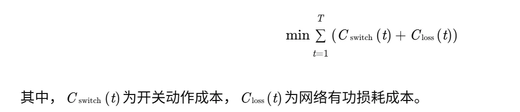 - 目标函数:以重构周期内开关动作耗费与网络有功损耗等综合成本最低为目标,例如: