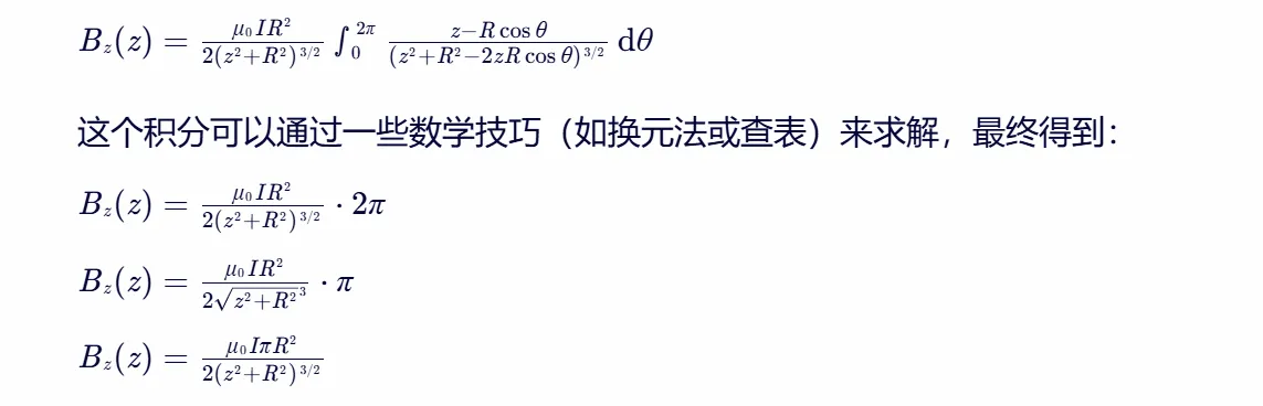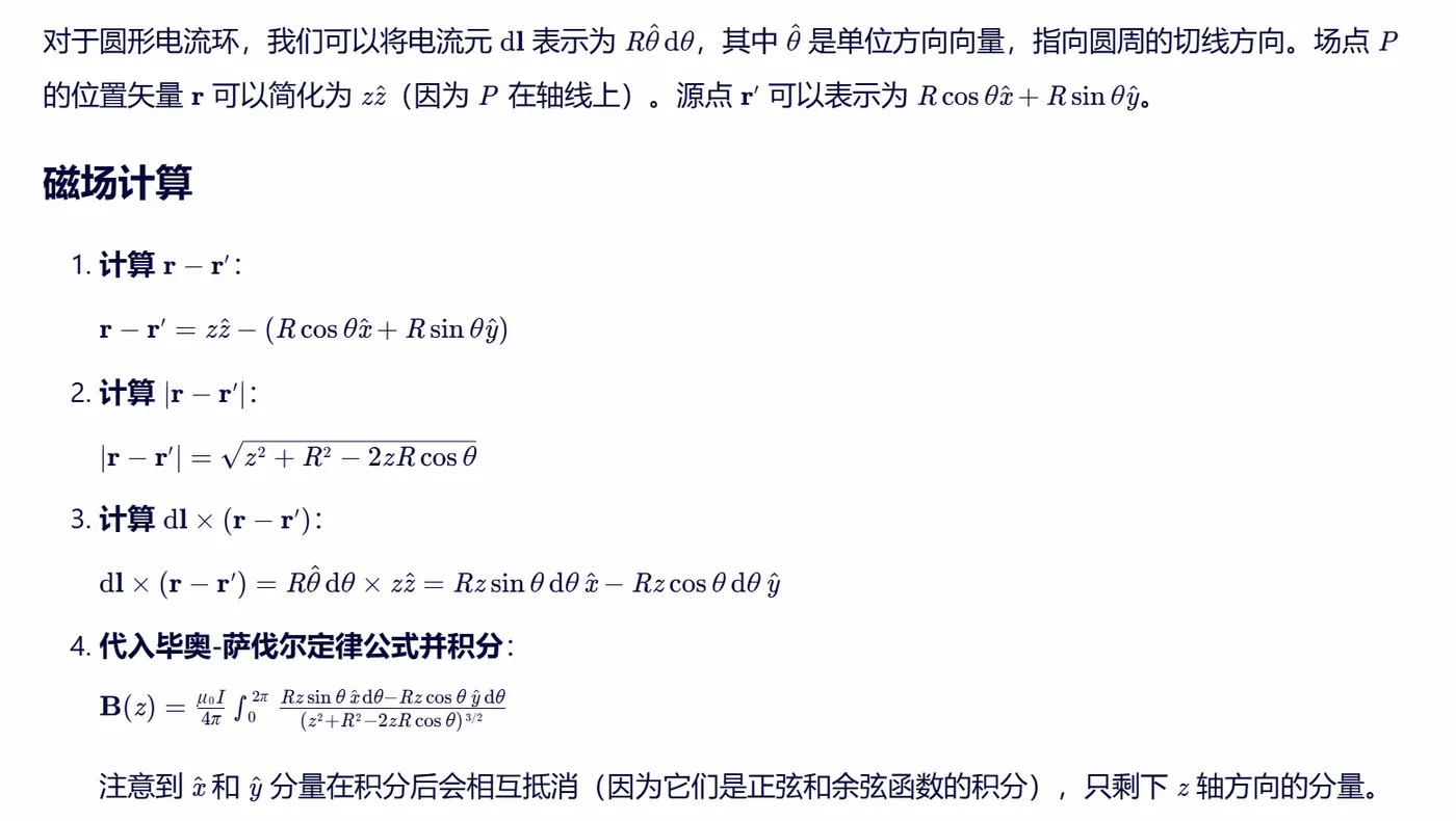这就是圆形电流环在轴线上某点 P 产生的磁感应强度的 z 分量。注意,这个公式在 z=0(即电流环中心)处是未定义的,因为分母会变为0。在实际应用中,需要避免这种情况或采用其他方法来处理。