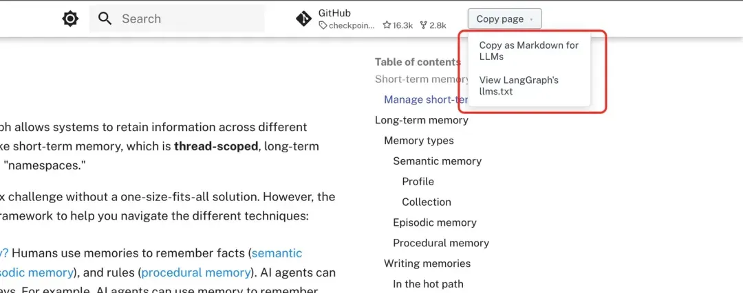 在 RAG 中,如果秉承“面向 LLM”开发,那么文档的格式需要为 LLM 容易理解的格式,比如为 markdown 格式。一些网站的设计,已经开始“面向 LLM”设计,比如上文提到的关于 Memory 分类的网页: LangGraph Memory中,右上角有有单独的两个文件,“Copy as Markdown for LLMs”就是直接copy 出当前网页的 markdown格式,更适合 LLM 理解。“llm.txt” 类似于整个网站页面为 LLM 设计的导航,里面为markdown格式的各个页面的说明与地址。