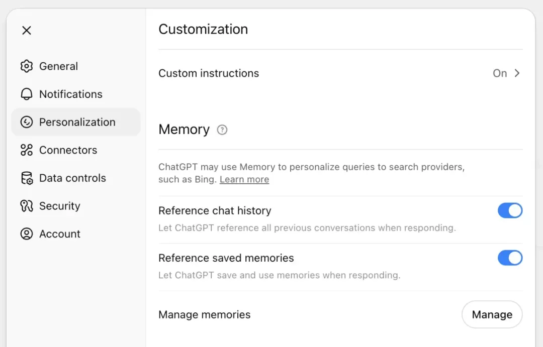 ChatGPT 的 Reference saved memories 功能: