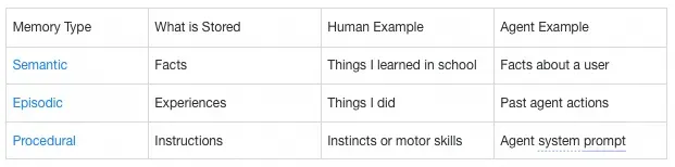 Semantic memory:语义记忆,无论是在人类还是人工智能智能体中,都涉及对特定事实和概念的保留。在人类中,它可以包括在学校学到的信息以及对概念及其关系的理解。对于人工智能智能体而言,语义记忆通常用于通过记住过去交互中的事实或概念来实现应用程序的个性化。