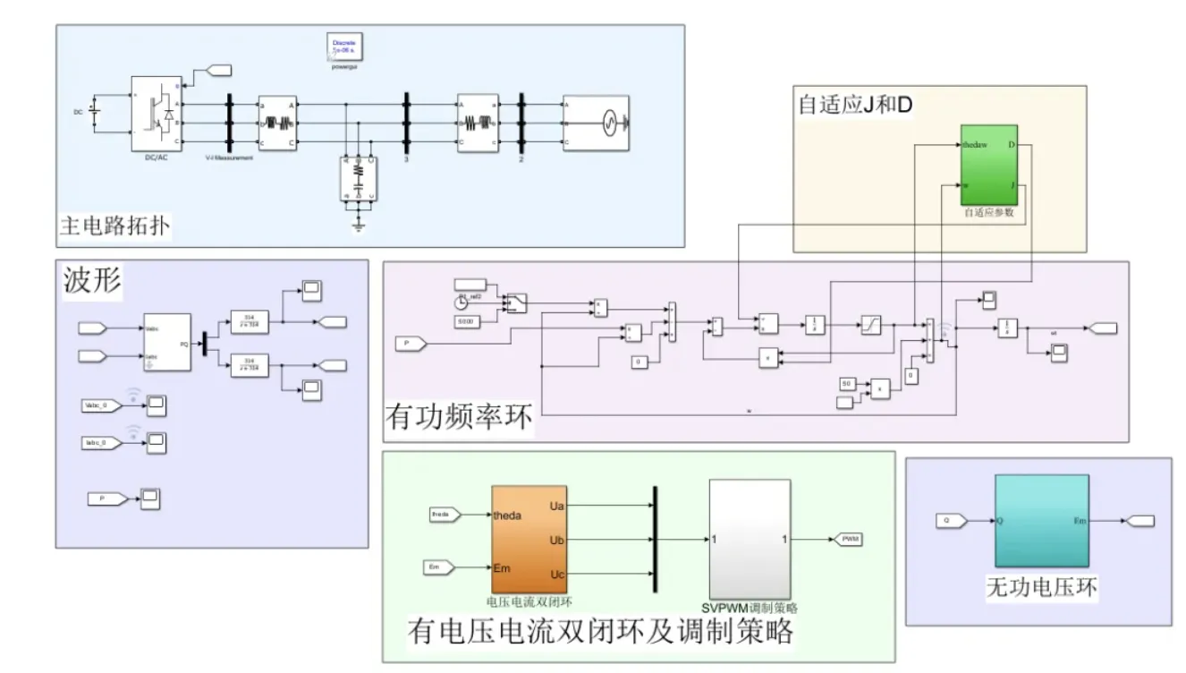 该模型和原文模型很像,包括较多子模块,有功频率环、电压电流双闭环及调制模块、无功电压环、自适应控制模块、PWM模块等。