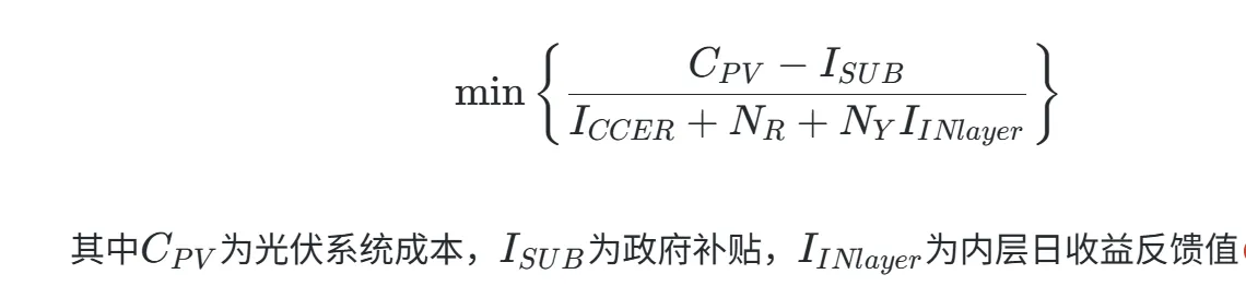 其中CPV为光伏系统成本,ISUB为政府补贴,IINlayer为内层日收益反馈值。 - 内层目标函数: