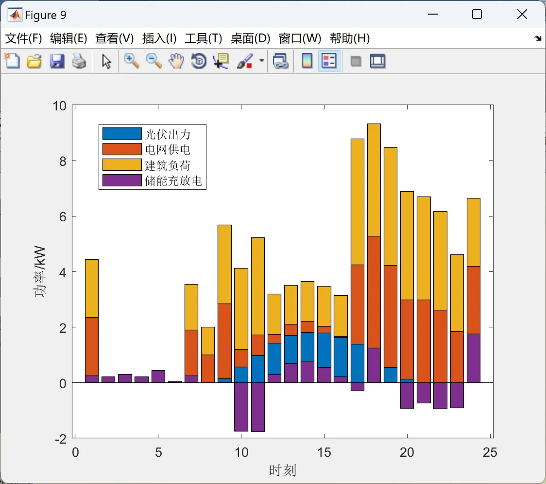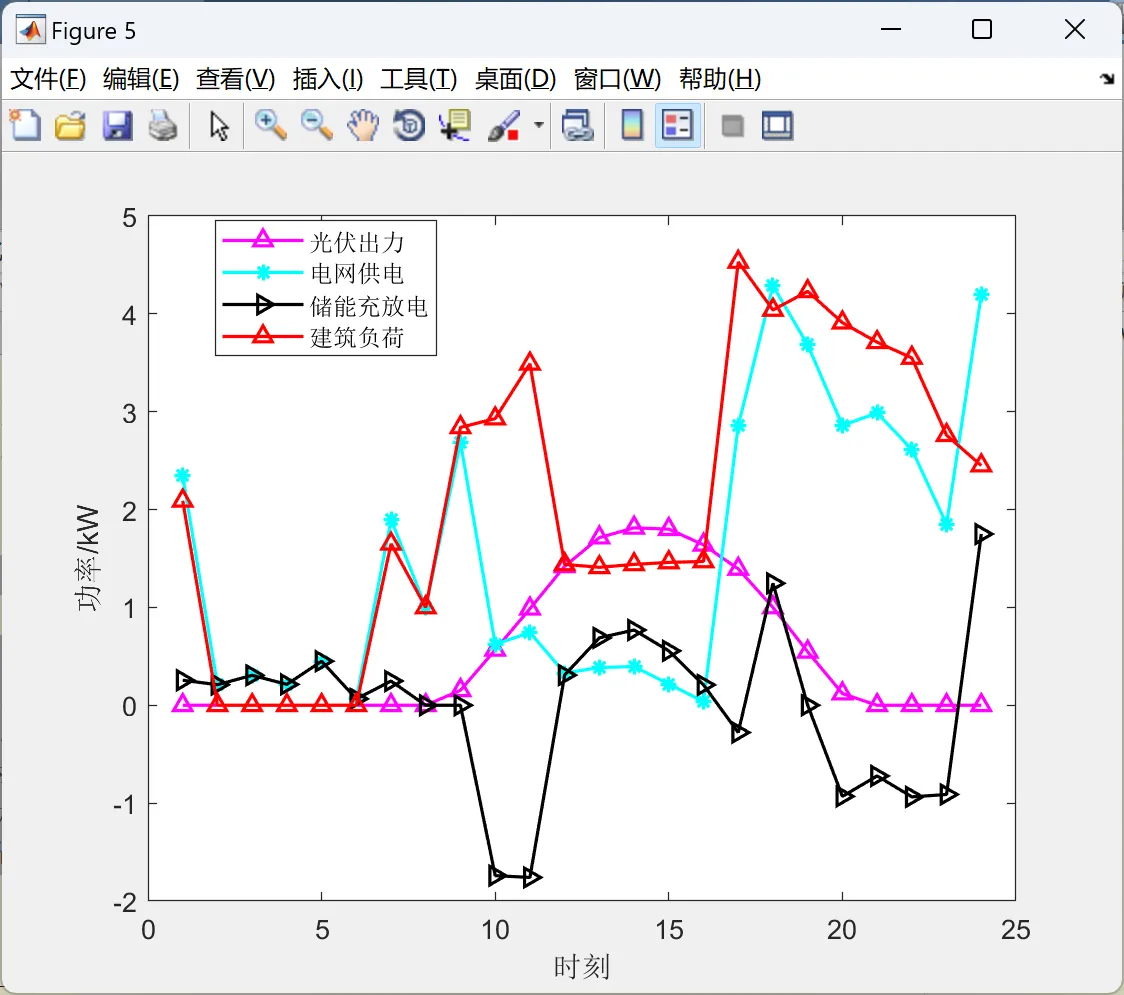 legend('光伏出力','电网供电','储能充放电','建筑负荷')