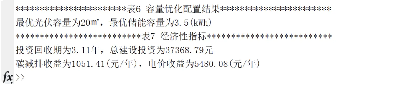 - 外层模型:以光伏板面积APVAPV和储能额定容量EbEb为决策变量,以投资回收期最短为目标函数,遍历容量备选集(光伏:20~160m²,步长5m²;储能:0.5~20kWh,步长0.5kWh)。