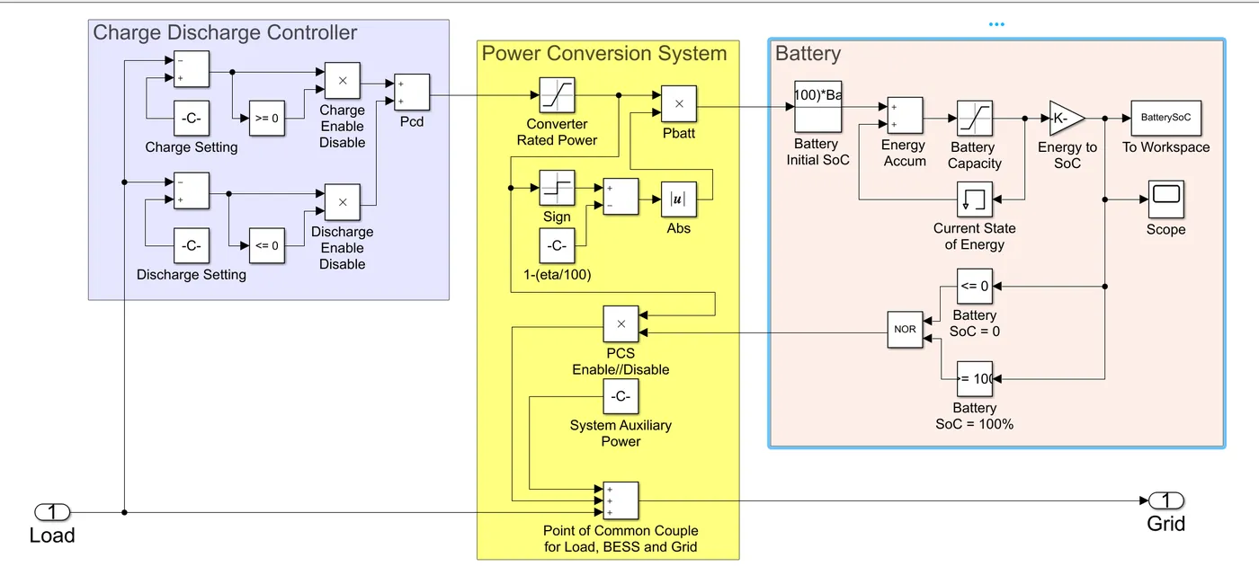 - BESS模块:集成电池充放电控制逻辑,包含SOC跟踪、功率限制等功能。