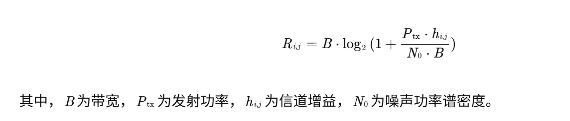 - 通信模型:采用香农公式计算传输速率,考虑路径损耗与干扰: