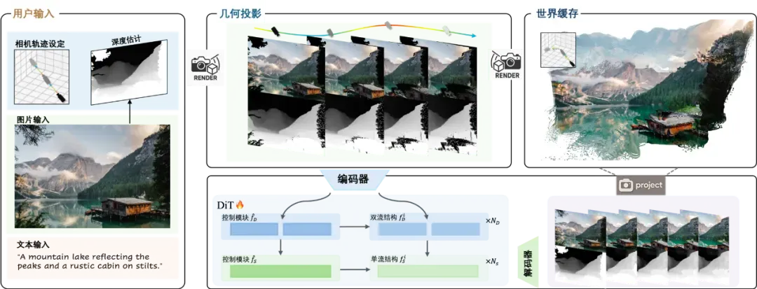 混元Voyager 还引入了可扩展的世界缓存机制,基于混元 3D 世界模型1.0生成的初始3D点云缓存,将其投影到目标相机视图,为扩散模型提供指导。此外,生成的视频帧还会实时更新缓存,形成闭环系统,支持任意相机轨迹,同时维持几何一致性。这不仅扩展了漫游范围,还为1.0模型补充新视角内容,提升整体生成质量。