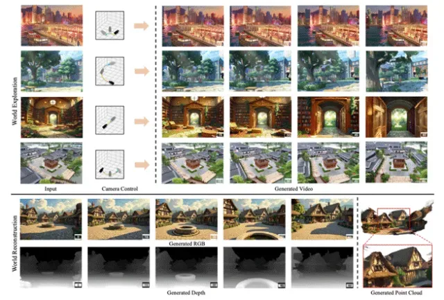 混元Voyager首次通过空间与特征结合的方式,支持原生的3D记忆和场景重建,避免了传统后处理带来的延迟和精度损失。同时,在输入端加入3D条件保证画面视角精准,输出端直接生成3D点云,适配多种应用场景。额外的深度信息还能支持视频场景重建、3D物体纹理生成、风格化编辑和深度估计等功能。