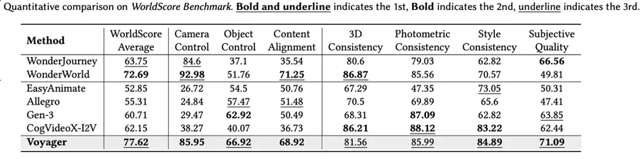 该模型在斯坦福大学李飞飞团队发布的世界模型基准测试WorldScore上位居综合能力首位,超越现有开源方法,在视频生成和3D重建任务中均表现出色。在视频生成和视频3D重建两个任务上,Voyager也均取得更好的结果。