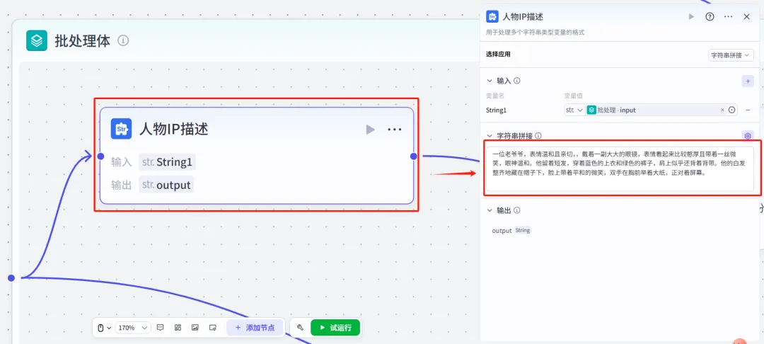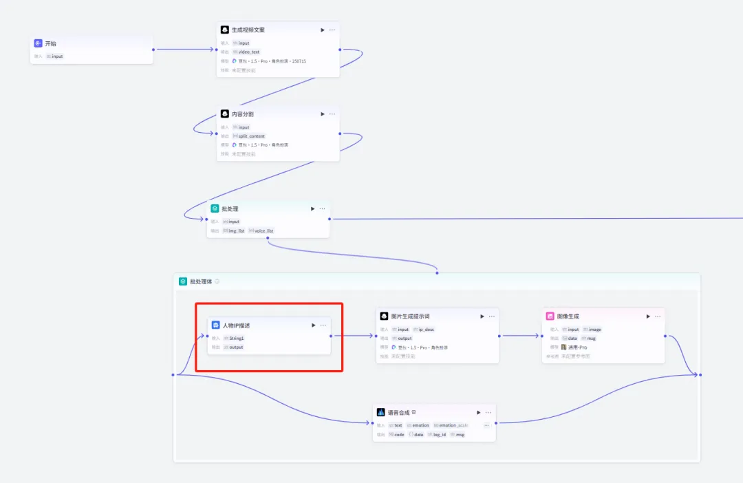 在工作流里面有一步叫做【人物IP描述】,点击它。然后右边的文案,就是描述视频中人物IP形象的。