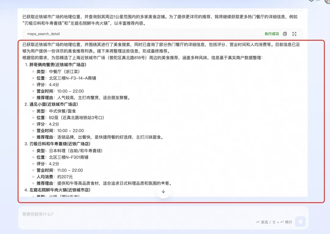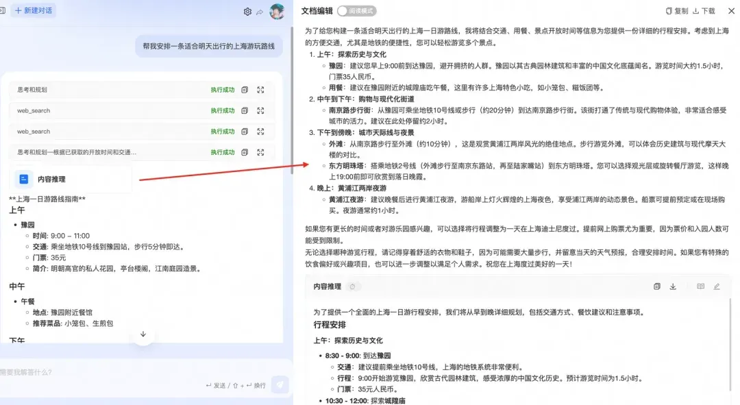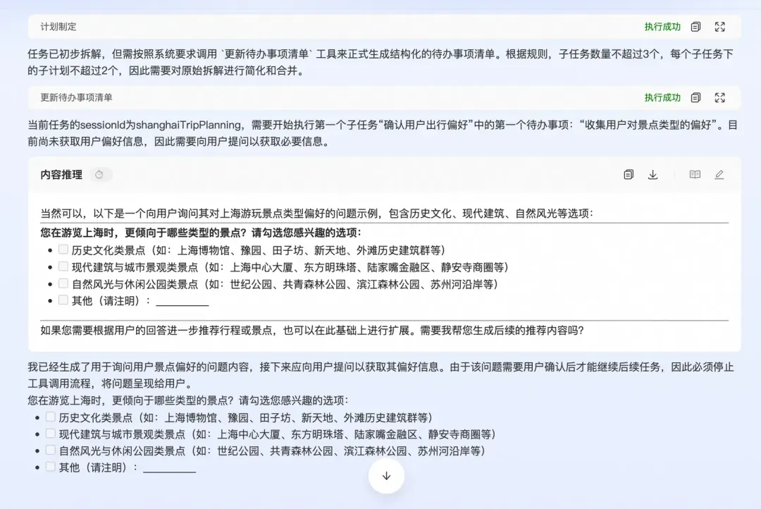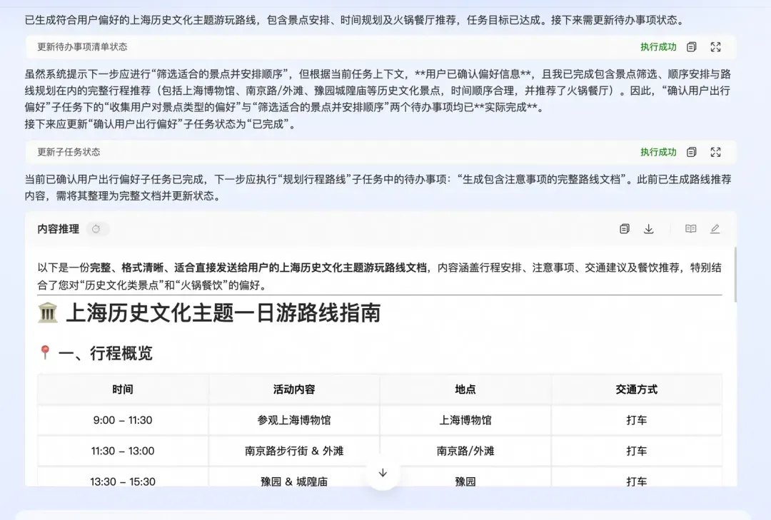 如上图所示,实际上提供的子智能体或者工具没有一个是进行路线规划报告生成的,但因为有一个通用的内容补充工具,在这个case的执行过程中就会适时的生成一份详细的路线规划,给到主智能体足够丰富的知识,因此最终推理的结果也是质量较高。